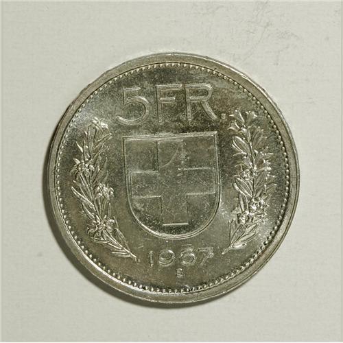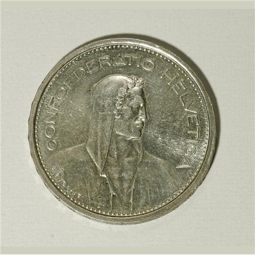 <B>Confederation. Error edge 5-Francs 1967-B,</B></I> KM-40 with edge reading PROVIDEBIT *** DOMINUS **********. Pleasing AU in grade.<BR><BR><b>Shipping:</b> Coins & Currency (<a target="_blank" href="http://www.heritageauctions.com/common/shipping.php">view shipping information</a>)