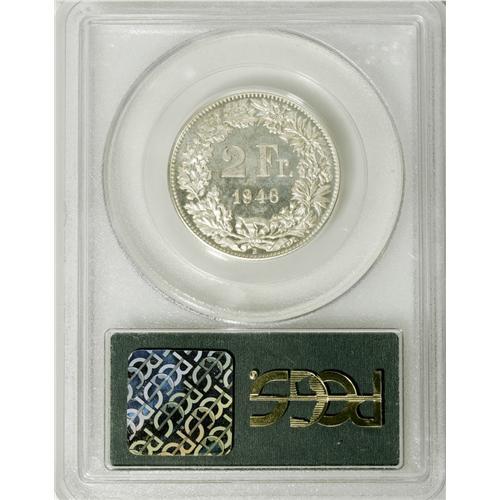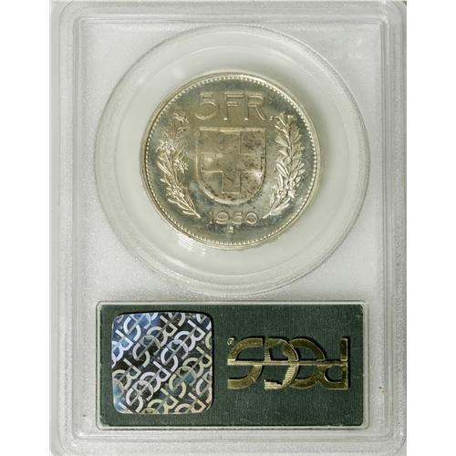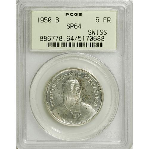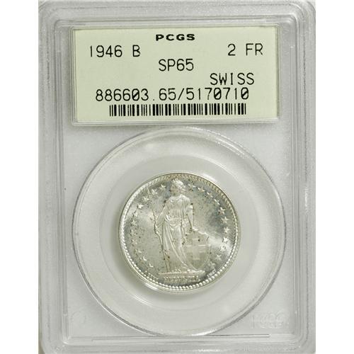 <B>Confederation. Glittering pair:</B></I> 2 Francs 1946-B, KM-21, SP65 PCGS, plus a 5 Francs 1950-B, KM-40, SP64 PCGS, each with bright mirror surfaces but some spotty toning. Krause value totals $780.<BR><BR><b>Shipping:</b> Coins & Currency (<a target="_blank" href="http://www.heritageauctions.com/common/shipping.php">view shipping information</a>)