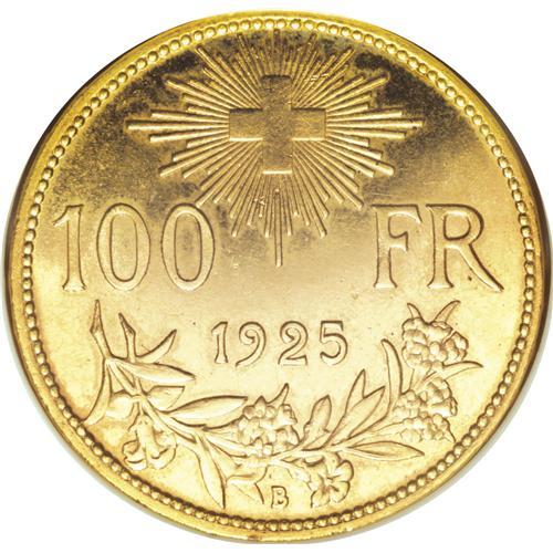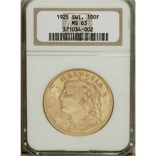 <B>Confederation. Gold 100 Francs 1925-B,</B></I> KM-39, 1-year type, always popular, MS63 NGC, a nice example. One noticeable mark right on Helvetia's chin.<BR><BR><b>Shipping:</b> Coins & Currency (<a target="_blank" href="http://www.heritageauctions.com/common/shipping.php">view shipping information</a>)