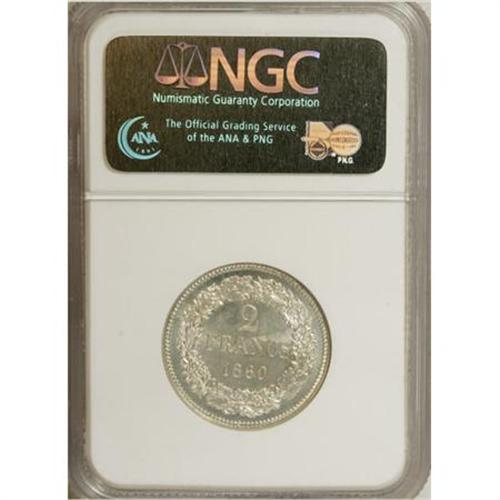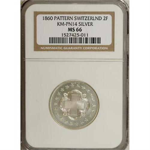 <B>Confederation. Pattern silver 2 Francs 1860,</B></I> KM-Pn14, MS66 NGC, a splendid piece booming with luster, silvery white with a few tiny abrasions and a hint of flecks of toning. Rare!<BR><BR><b>Shipping:</b> Coins & Currency (<a target="_blank" href="http://www.heritageauctions.com/common/shipping.php">view shipping information</a>)