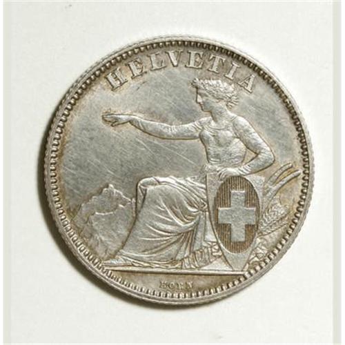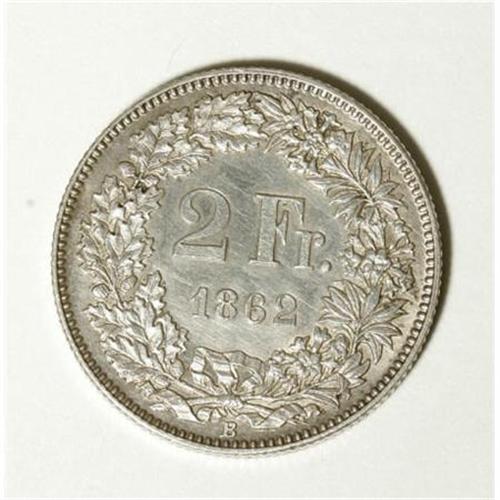 <B>Confederation. Silver 2 Francs 1862-B,</B></I> KM-10a, XF, light gray surfaces.<BR><BR><b>Shipping:</b> Coins & Currency (<a target="_blank" href="http://www.heritageauctions.com/common/shipping.php">view shipping information</a>)