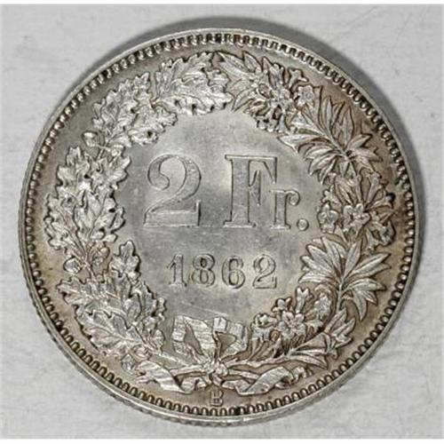 <B>Confederation. Silver 2 Francs 1862-B,</B></I> KM-10a, lustrous XF.<BR><BR><b>Shipping:</b> Coins & Currency (<a target="_blank" href="http://www.heritageauctions.com/common/shipping.php">view shipping information</a>)