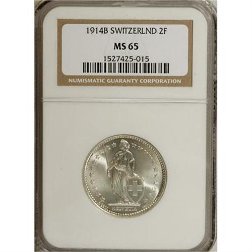 <B>Confederation. Silver 2 Francs 1914-B,</B></I> KM-21, MS65 NGC, booming mint frost!<BR><BR><b>Shipping:</b> Coins & Currency (<a target="_blank" href="http://www.heritageauctions.com/common/shipping.php">view shipping information</a>)