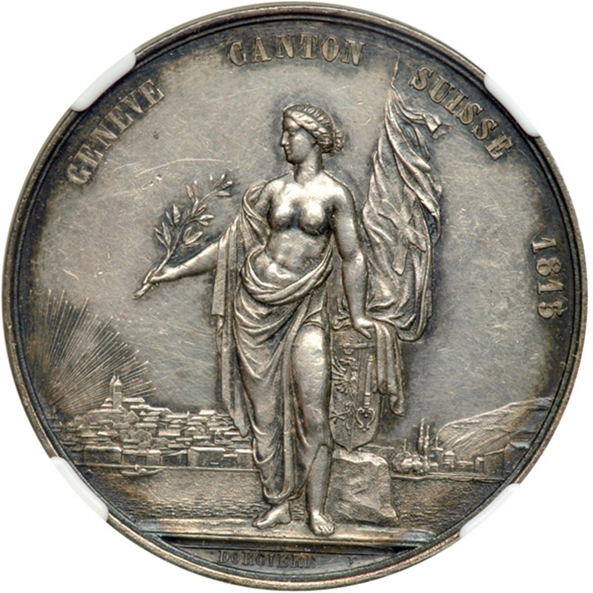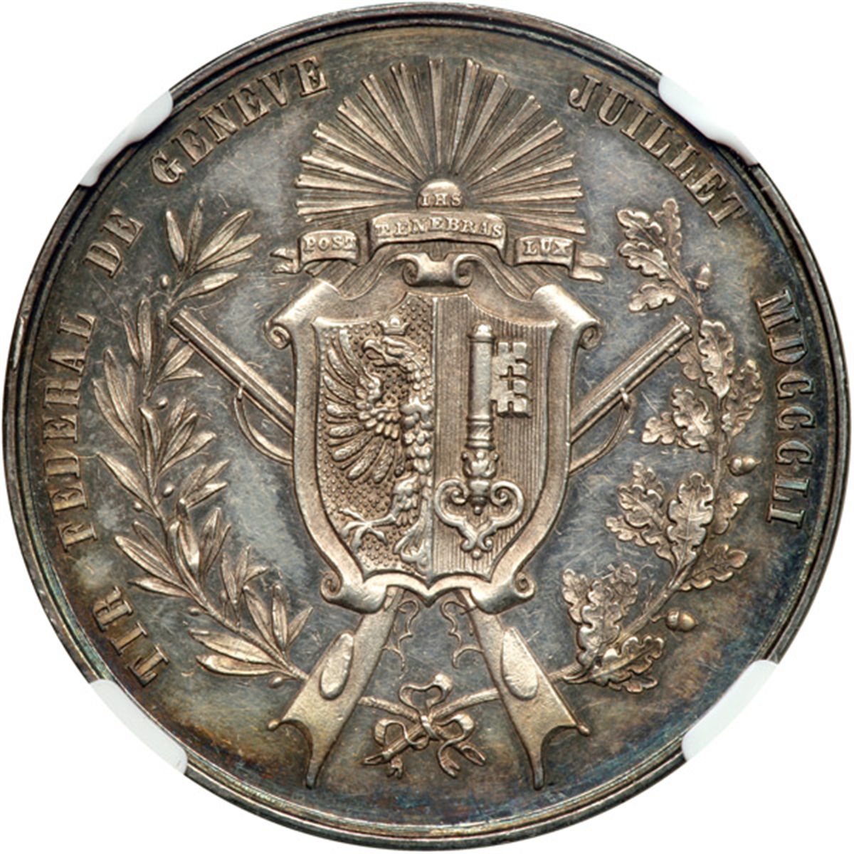 Switzerland. Medal, 1851. R-572b. Silver. 38 mm. Shooting Festival at Geneva. NGC graded AU-55.