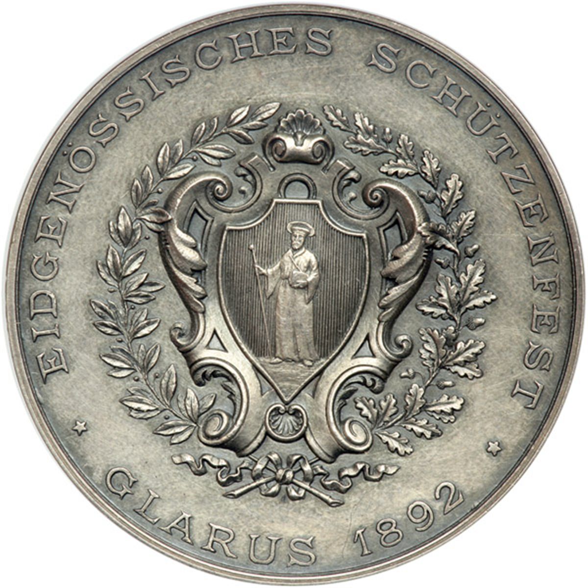 Switzerland. Medal, 1892. R-808b. Silver. 45 mm. For the Shooting Festival at Glarus. NGC graded About Uncirculated, Details (Surface Hairlines).