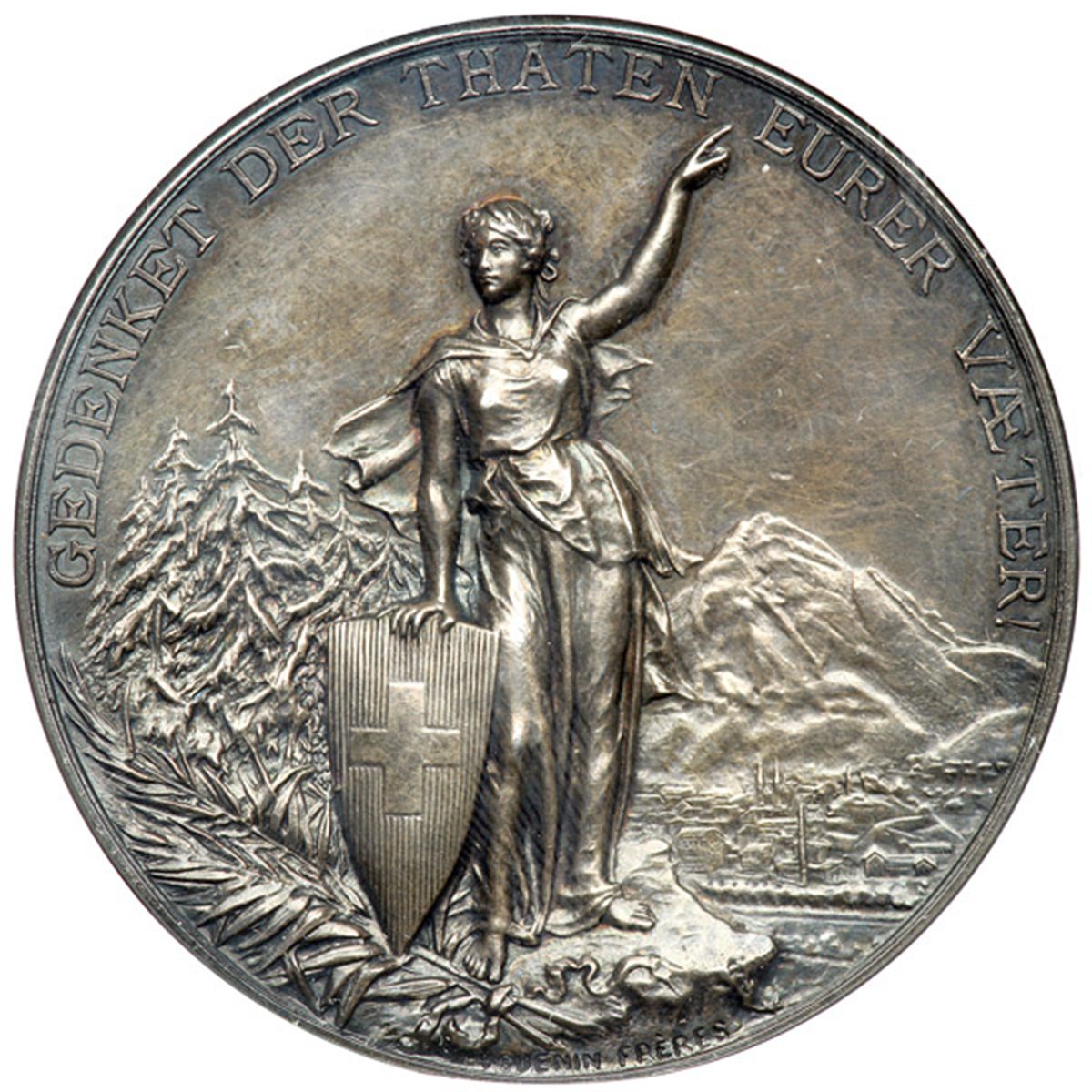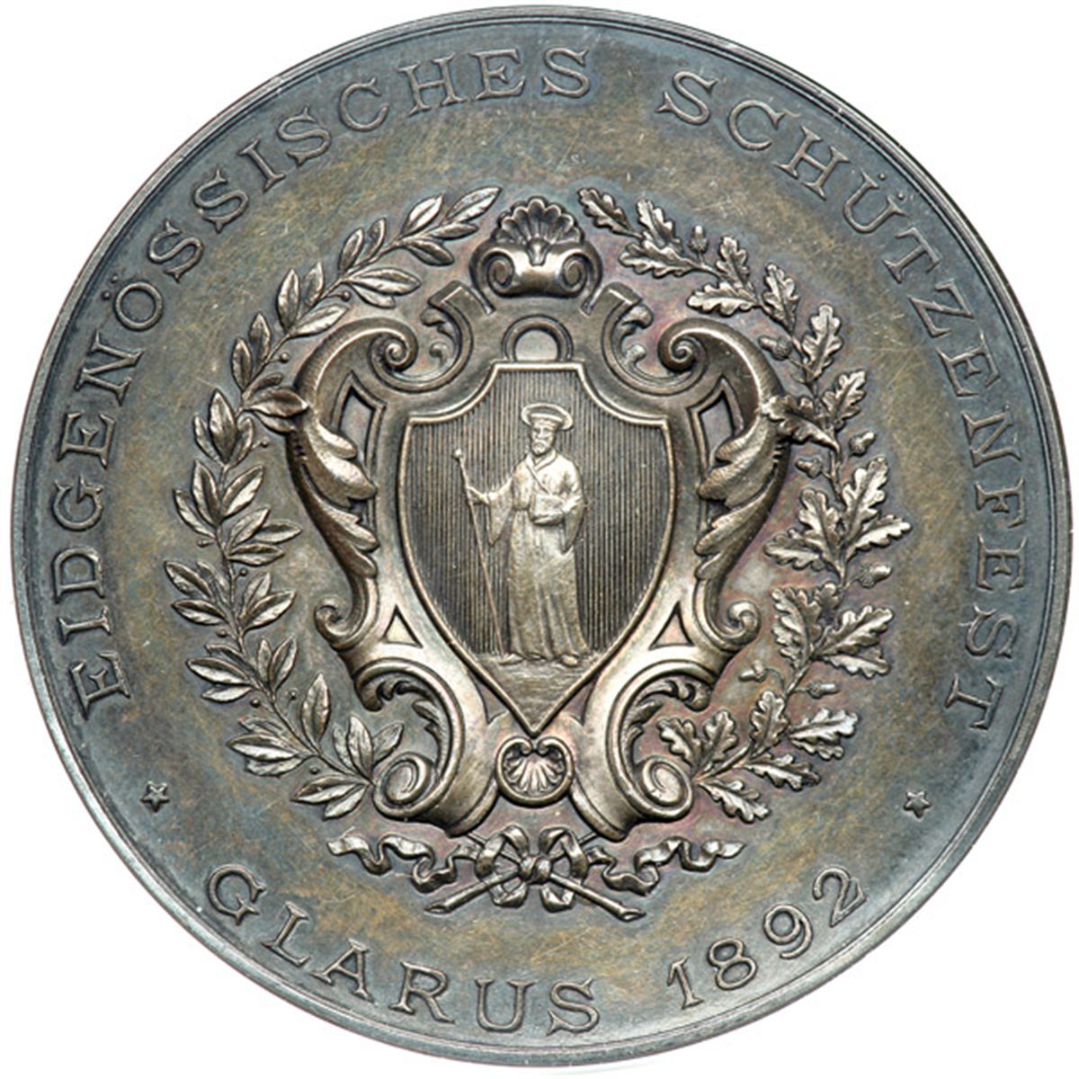 Switzerland. Medal, 1892. R-808b. Silver. 45 mm. For the Shooting Festival at Glarus. Toned. NGC graded Uncirculated, Details (Surface Hairlines).