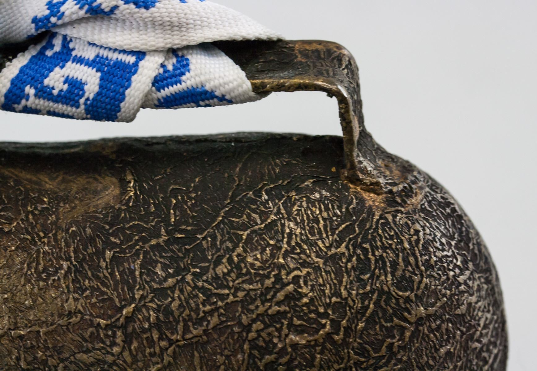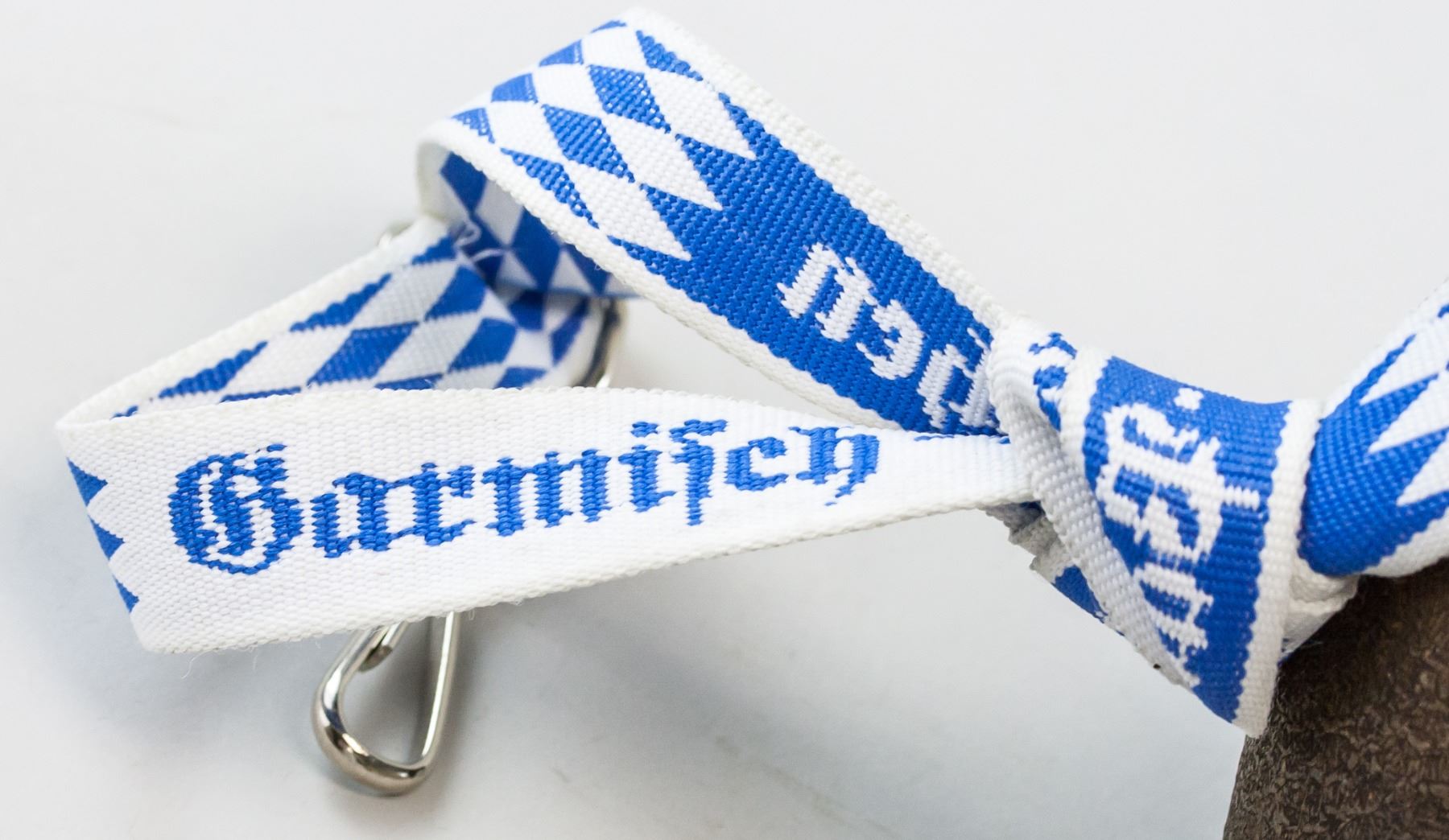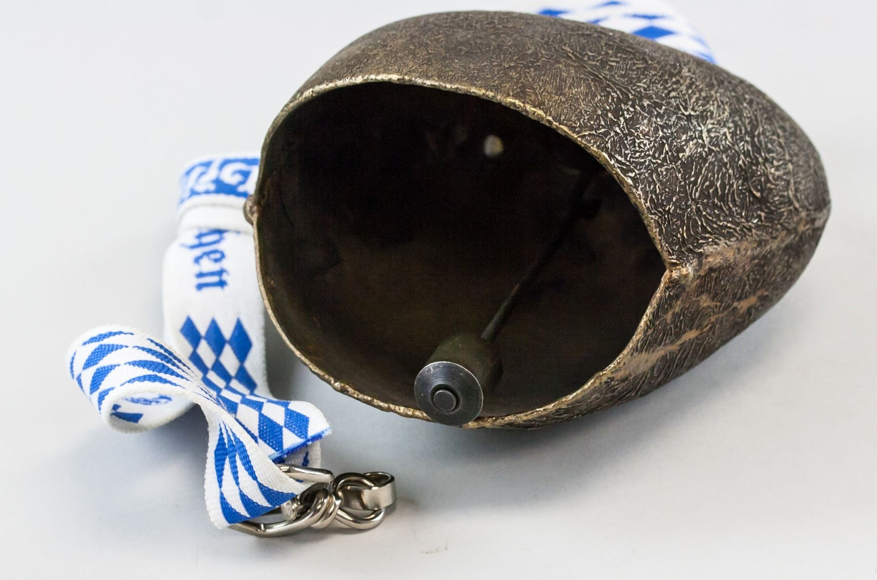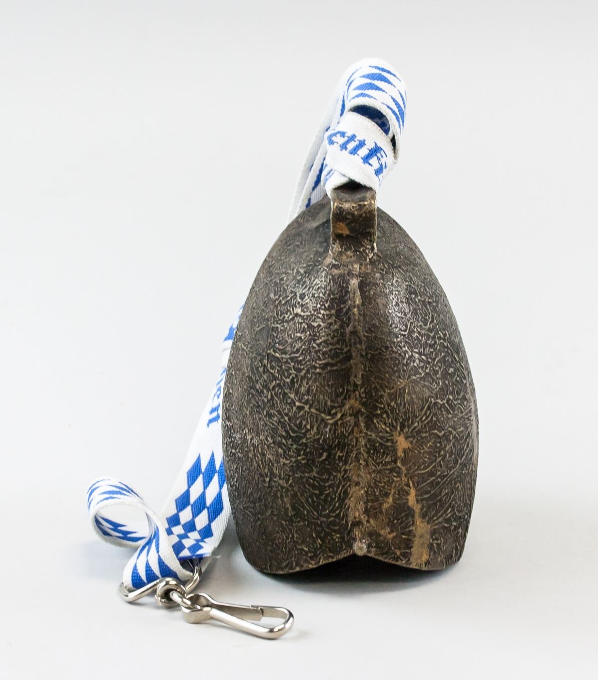 Metal cow bell. With a blue and white lanyard attached. 14 x 11 cm. 520 grams