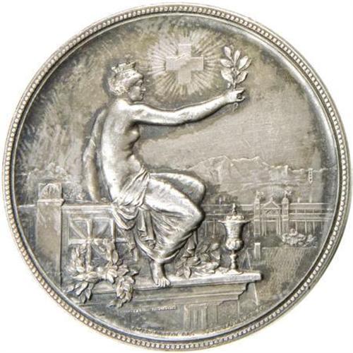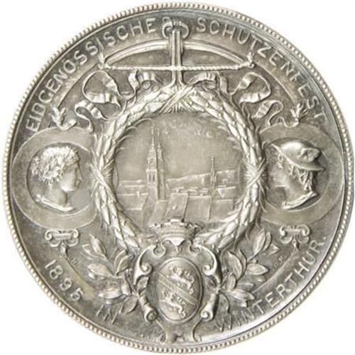 <B>Switzerland Shooting Medal From Zurich.</B></I> Kr-361. Silver, 45 mm, 38.4 gm. Swiss shooting medal from Zurich, Federal Shooting Festival at Winterthur, engraved by G. Hantz, dated 1895. <BR> <BR> <BR><BR><b>Shipping:</b> Coins & Currency (<a target="_blank" href="http://www.heritageauctions.com/common/shipping.php">view shipping information</a>)