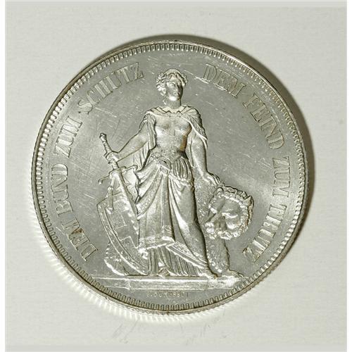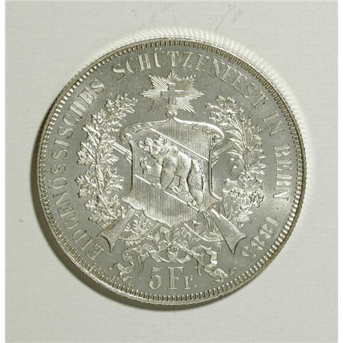 <B>Shooting Taler, Bern. 5 Francs 1885,</B></I> KM-S17, Brilliant Uncirculated, satiny luster and sharp, but obverse has abrasions.<BR><BR><b>Shipping:</b> Coins & Currency (<a target="_blank" href="http://www.heritageauctions.com/common/shipping.php">view shipping information</a>)