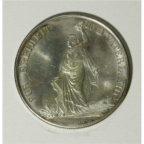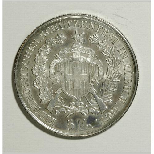 <B>Shooting Taler, Zurich. 5 Francs 1872,</B></I> KM-S11, Uncirculated with lovely satiny surfaces, sharp strike, delicate golden toning over booming silvery luster. Looks like a gem but has faint hairlines.<BR><BR><b>Shipping:</b> Coins & Currency (<a target="_blank" href="http://www.heritageauctions.com/common/shipping.php">view shipping information</a>)