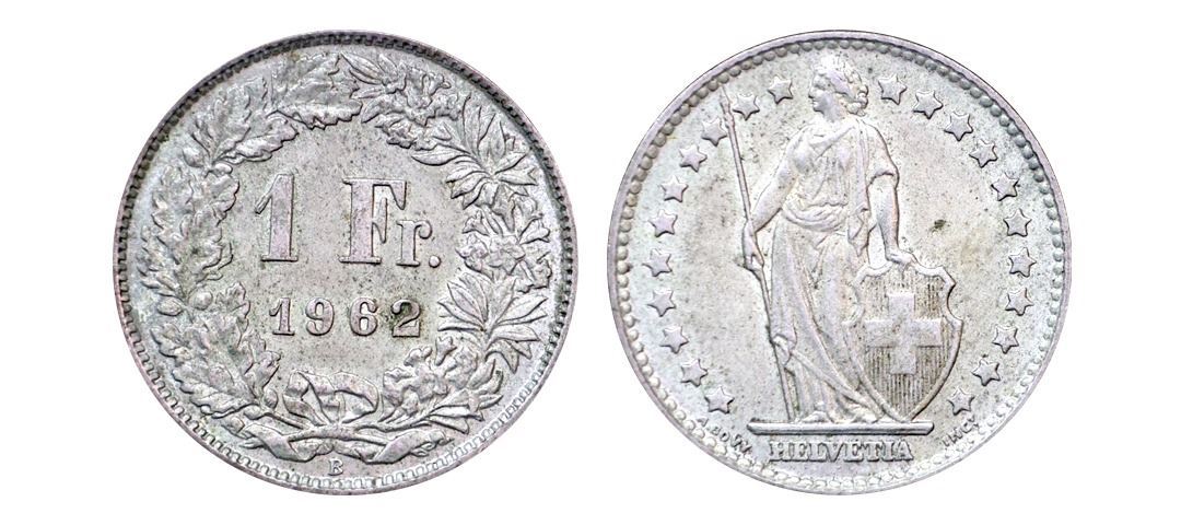 Switzerland, Silver 1 Francs, 5.3 gms, 1962, very fine, scarce.