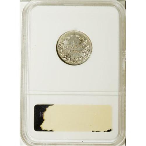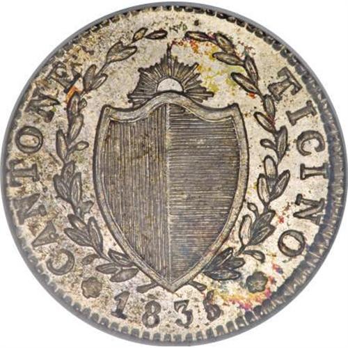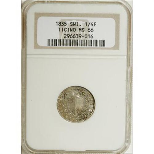 <B>Ticino silver 1/4 Franco 1835,</B></I> KM-7, MS66 NGC, a gorgeous gem, 100% original, with silvery surfaces showing hues of gold iridescence. One of just 58,000 minted of the type, only in this one year.<BR><BR><b>Shipping:</b> Coins & Currency (<a target="_blank" href="http://www.heritageauctions.com/common/shipping.php">view shipping information</a>)