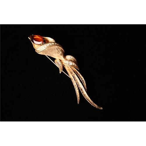 Unusual swooping goldtone brooch with a princess cut amber color rhinestone nestled in an etched goldtone cornucopia with three short and three longer undulating etched goldtone tails. Length: 4 7/8", Width: 1".