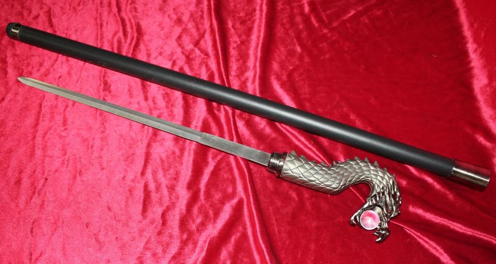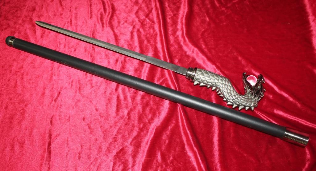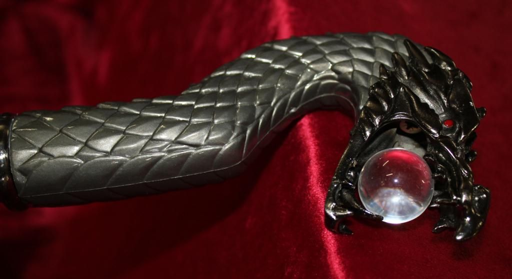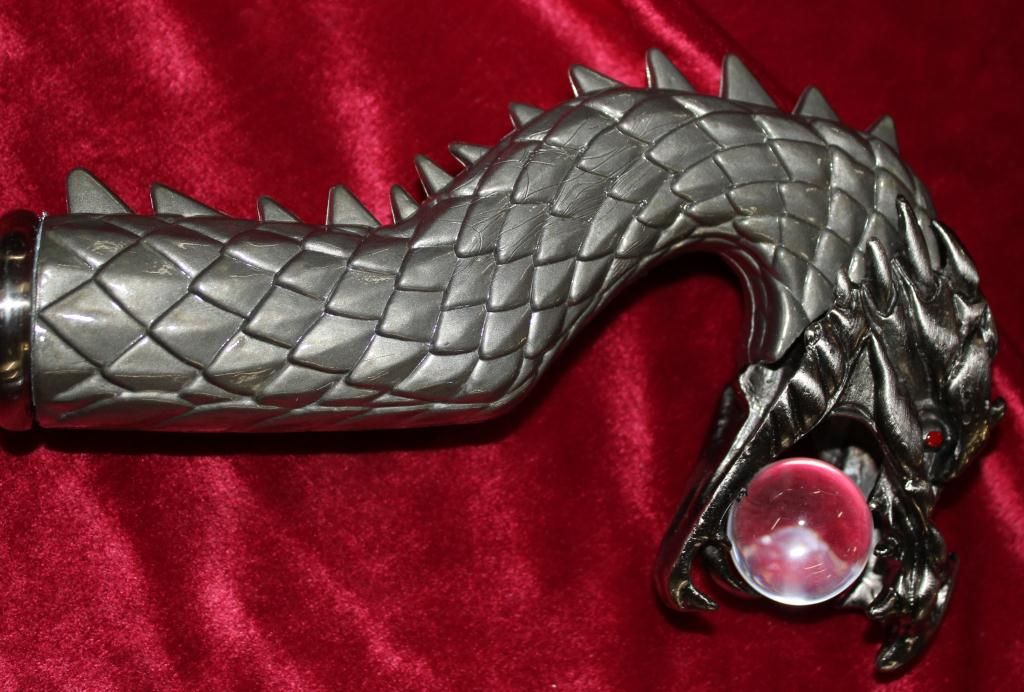 Clear Crystal Sphere In Mouth. Black With Silver Tone Handle. 35" Overall Length, 12" Sword
