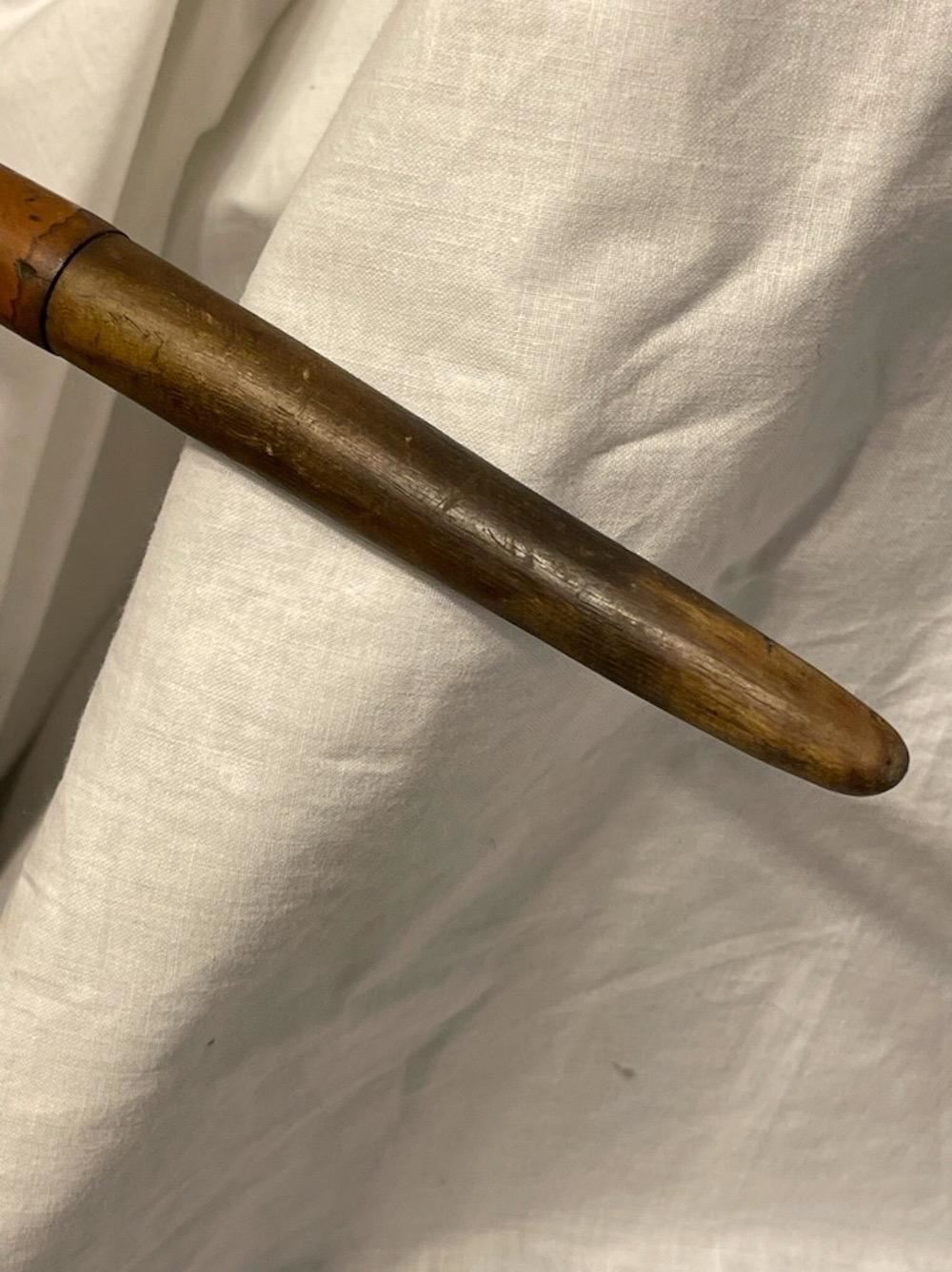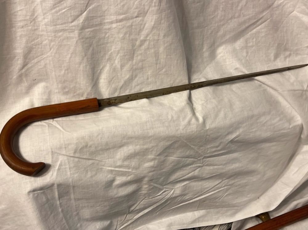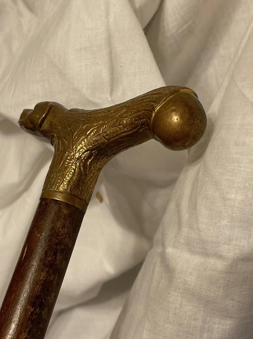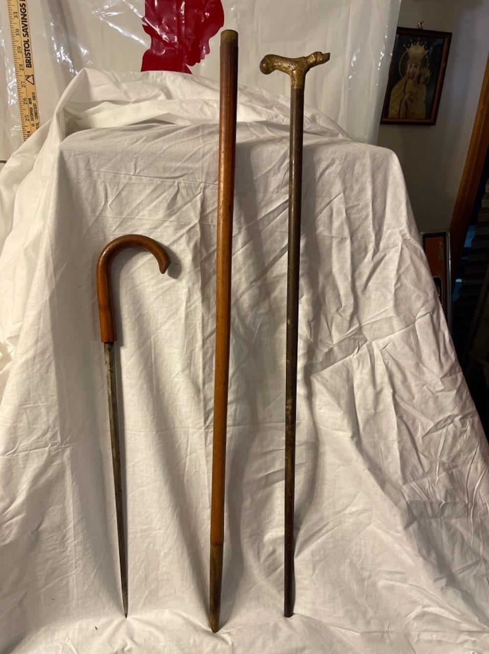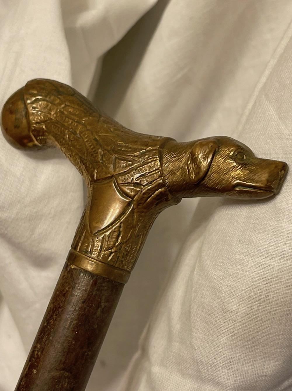 Sword cane and very heavy handled bronze dog head can, could have been used for protection, c. early 1860s.
