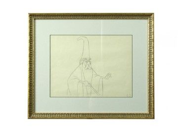 From Disney's classic animation feature "The Sword In The Stone" (1963), this is a detailed original pencil production animation drawing of Merlin the Magician. It is beautifully double matted, and encased in a gold painted frame. (Drawing is approx. 15.5"x13", gold frame is approx. 22.25" x 18.75" x 1". Comes with a COA.