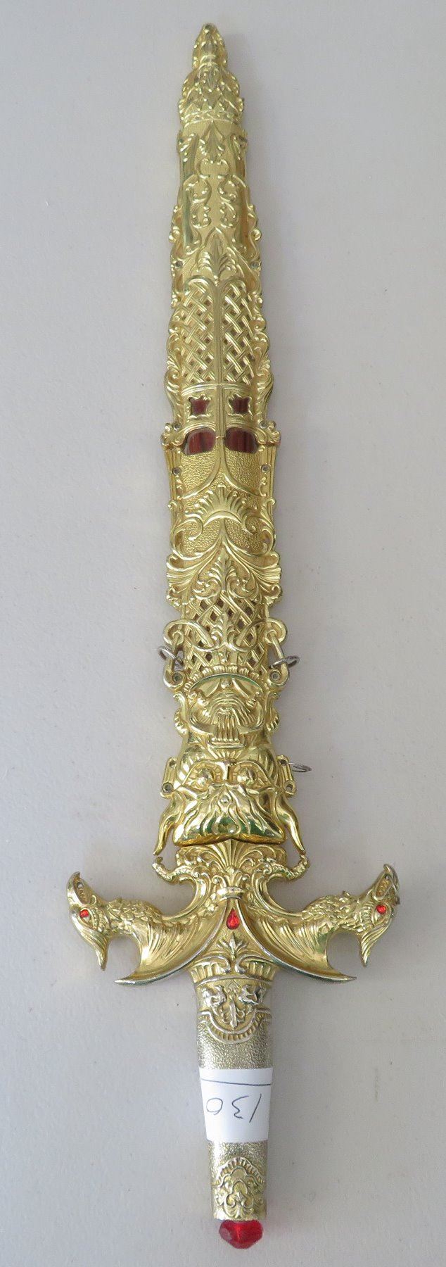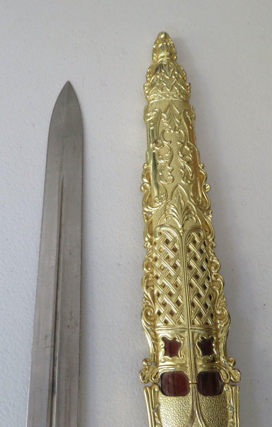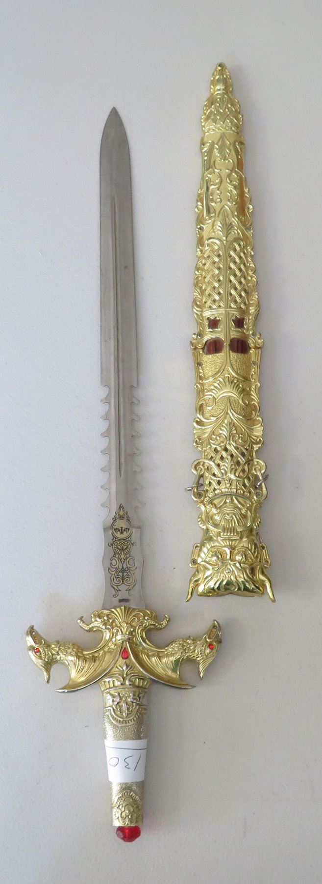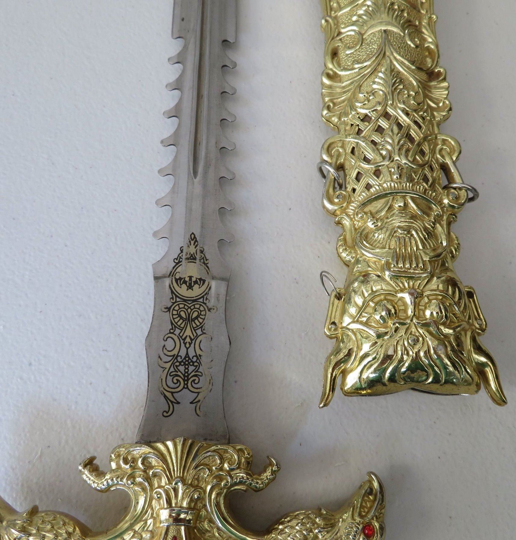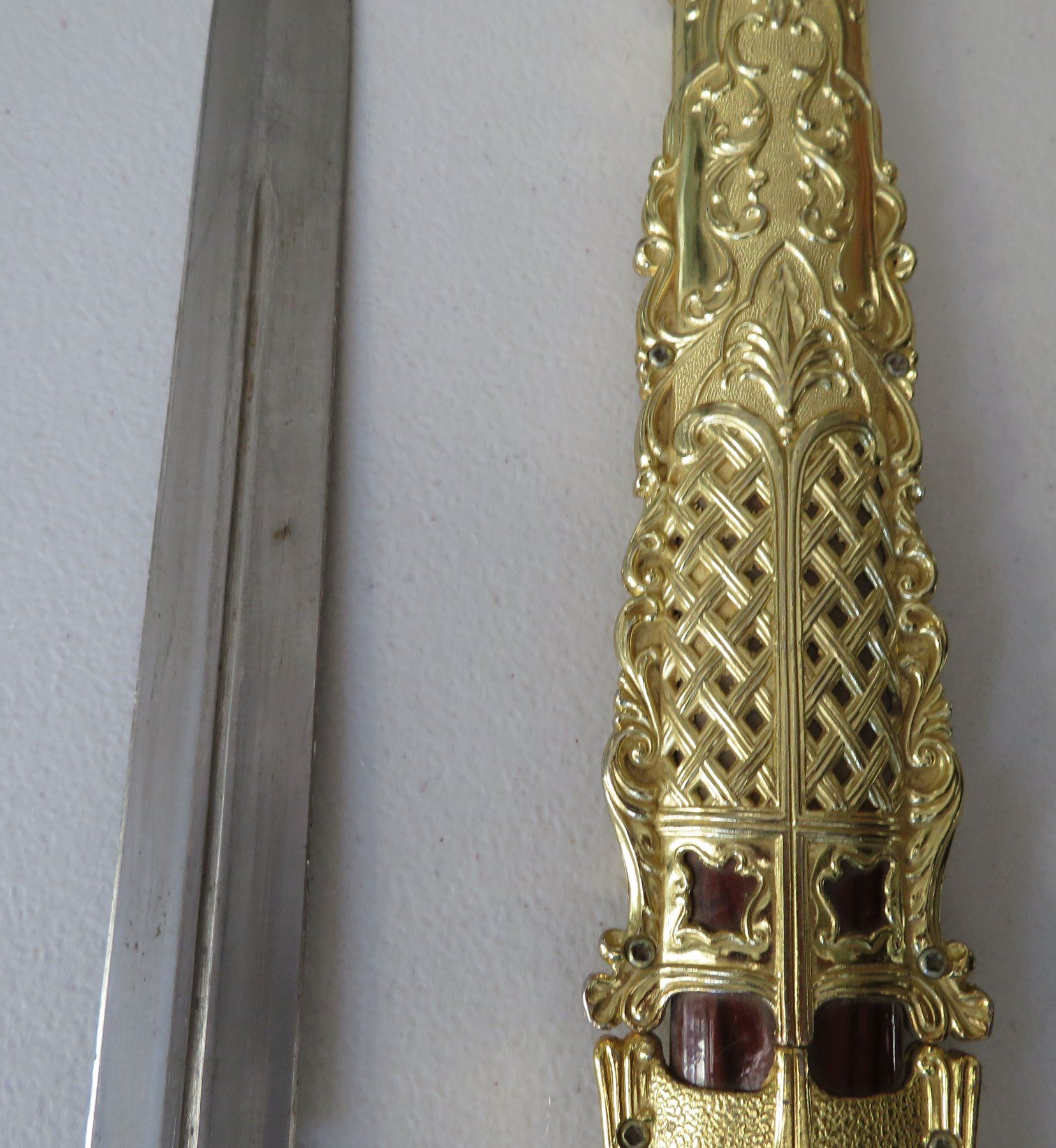 Sword & Sheath, modern item. Made of glass, steel and brass, the item measures 23" x 5" overall. China. Gold-colored finish. Condition: Good, see images. Shipping: $32.50 w/insurance and signature, due to size and weight.