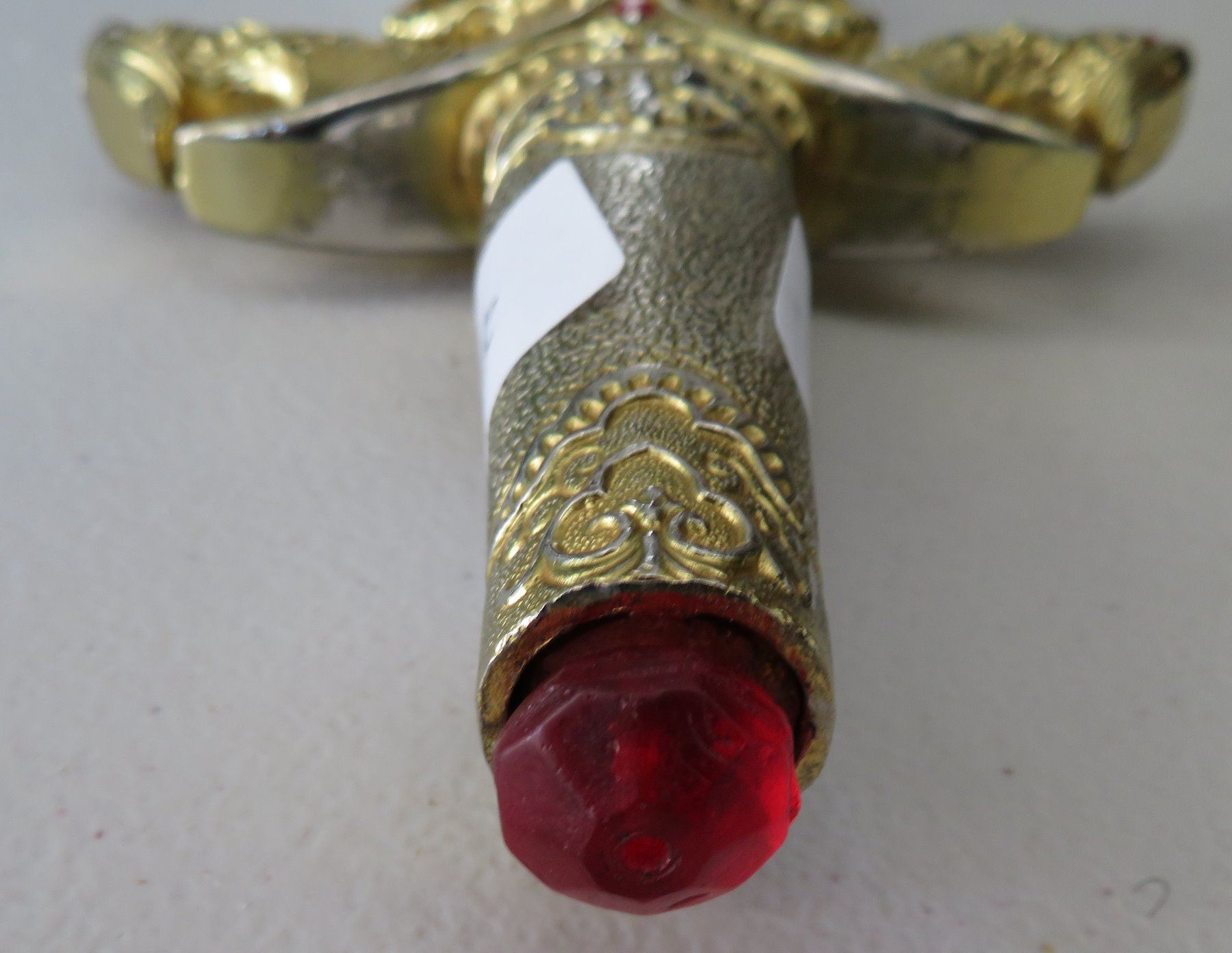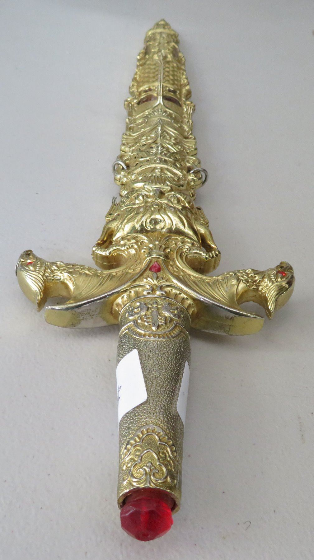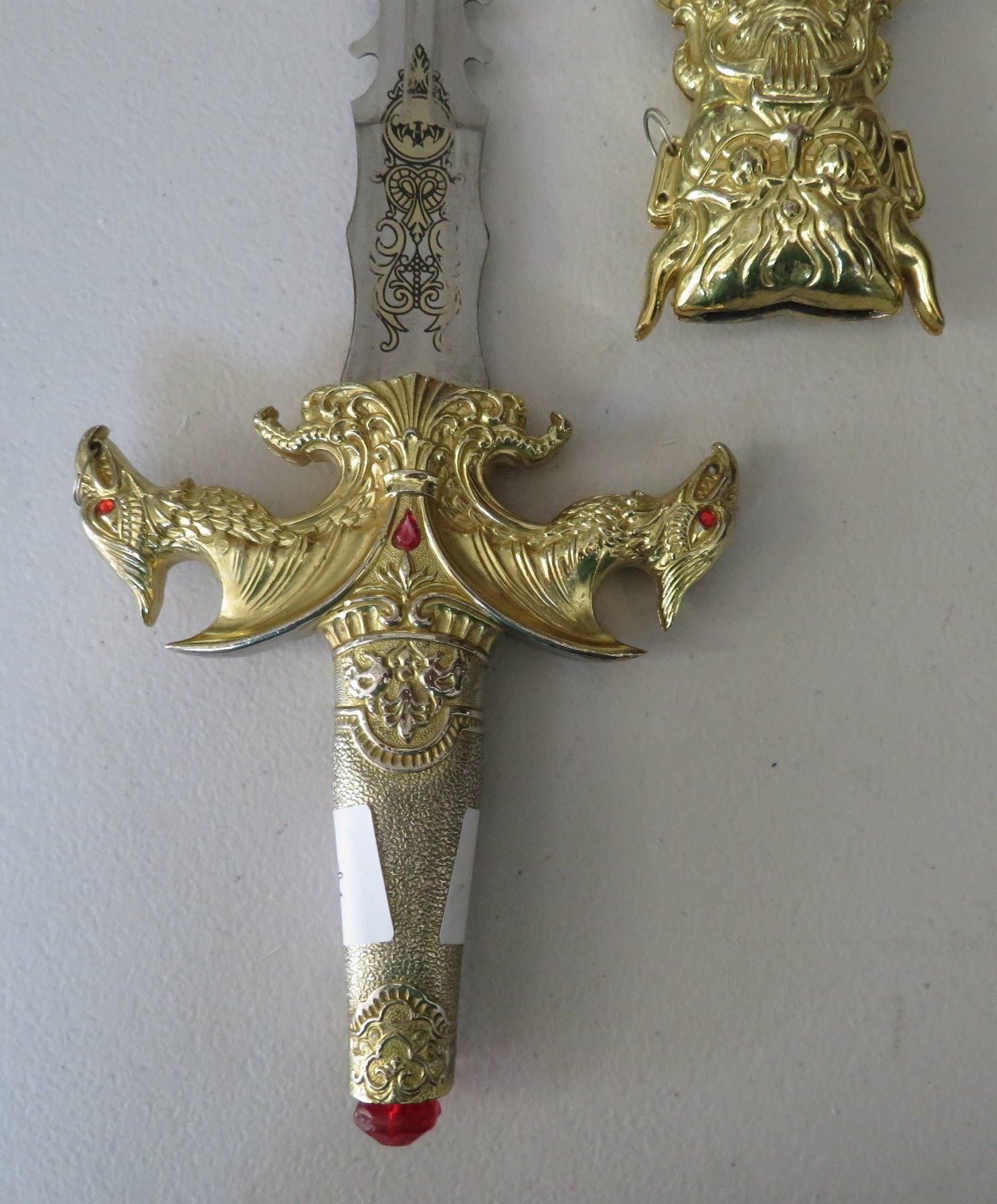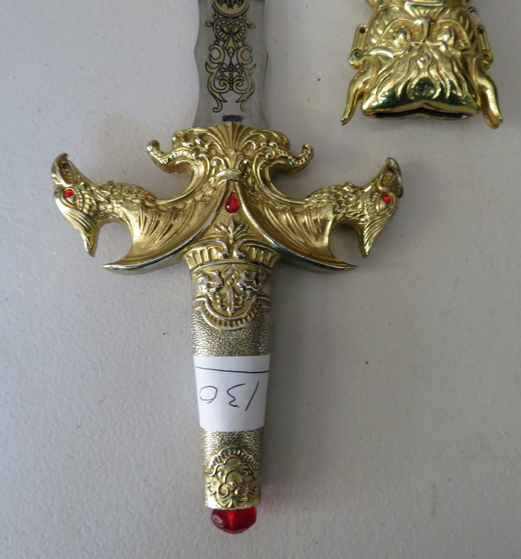 Sword & Sheath, modern item. Made of glass, steel and brass, the item measures 23" x 5" overall. China. Gold-colored finish. Condition: Good, see images. Shipping: $32.50 w/insurance and signature, due to size and weight.