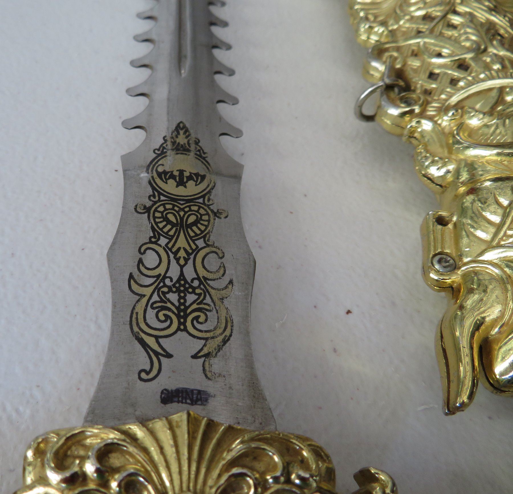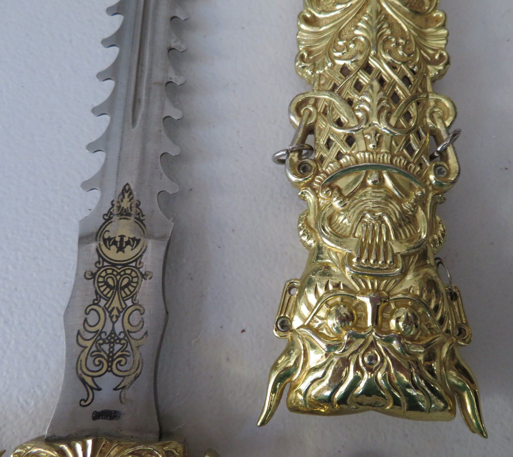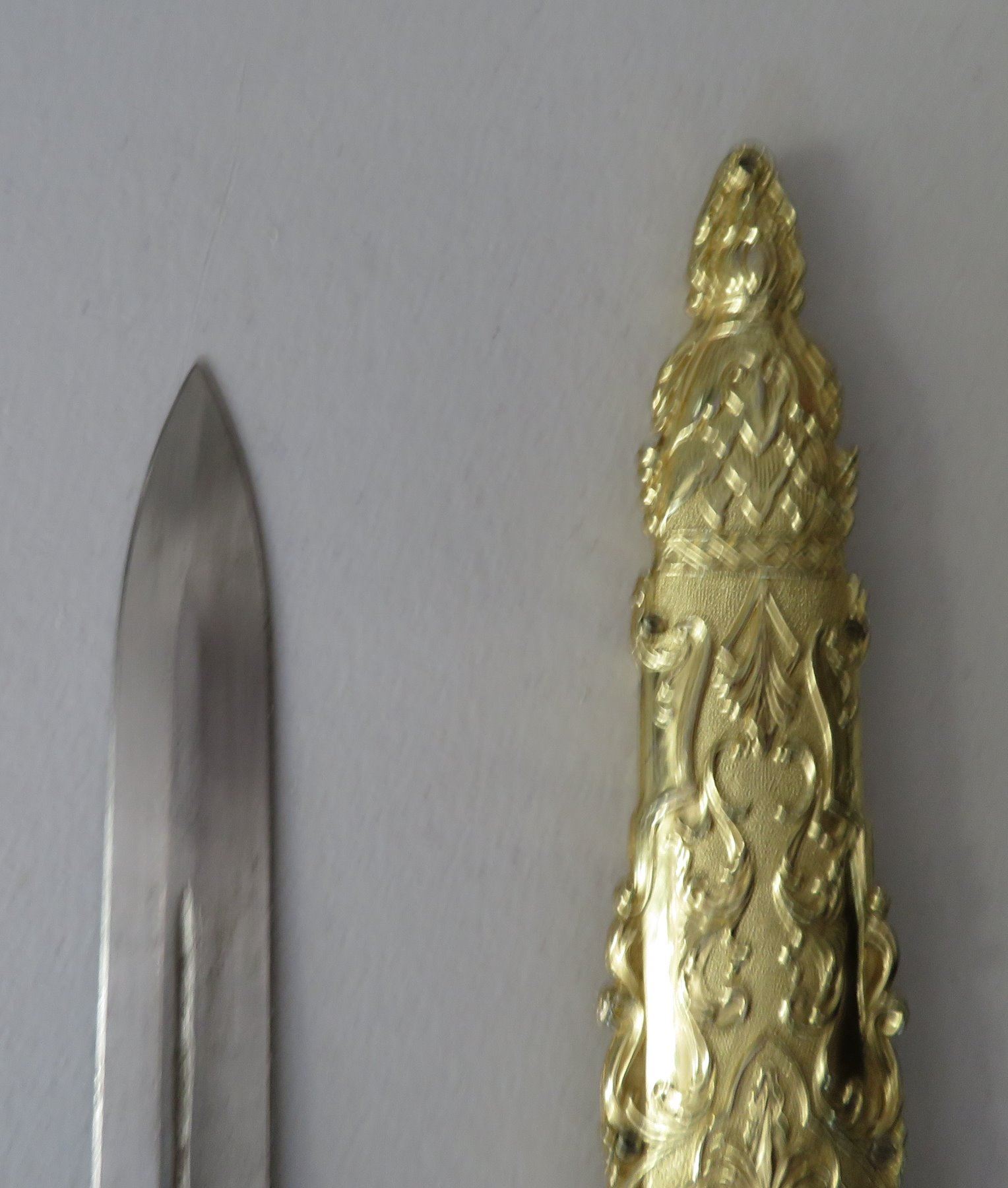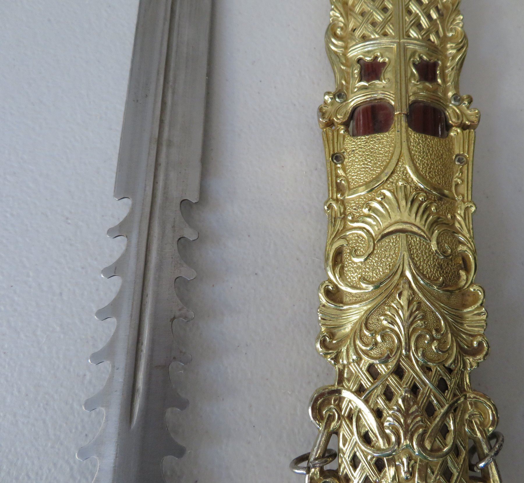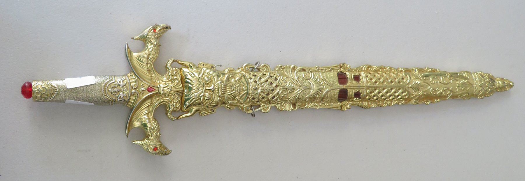 Sword & Sheath, modern item. Made of glass, steel and brass, the item measures 23" x 5" overall. China. Gold-colored finish. Condition: Good, see images. Shipping: $32.50 w/insurance and signature, due to size and weight.