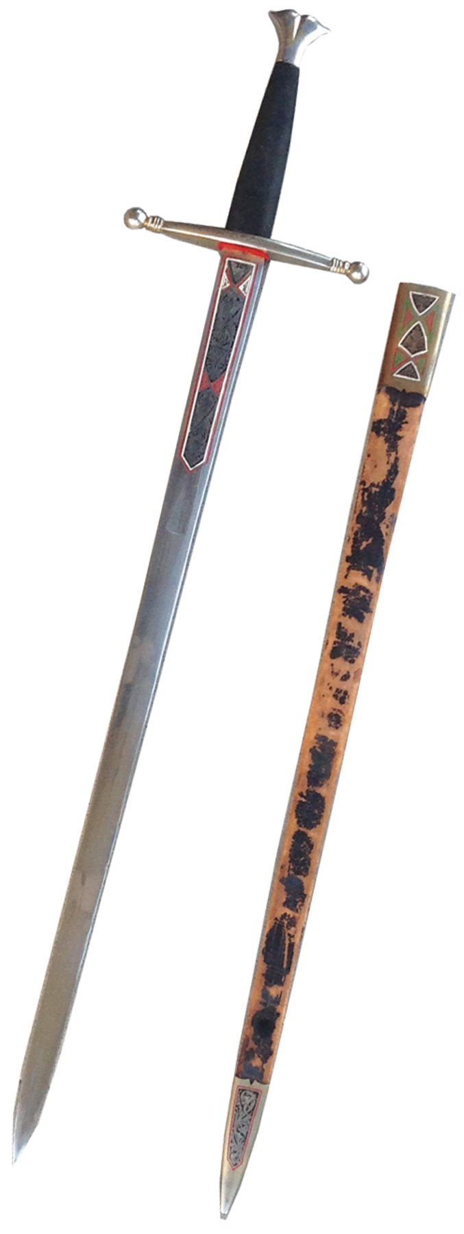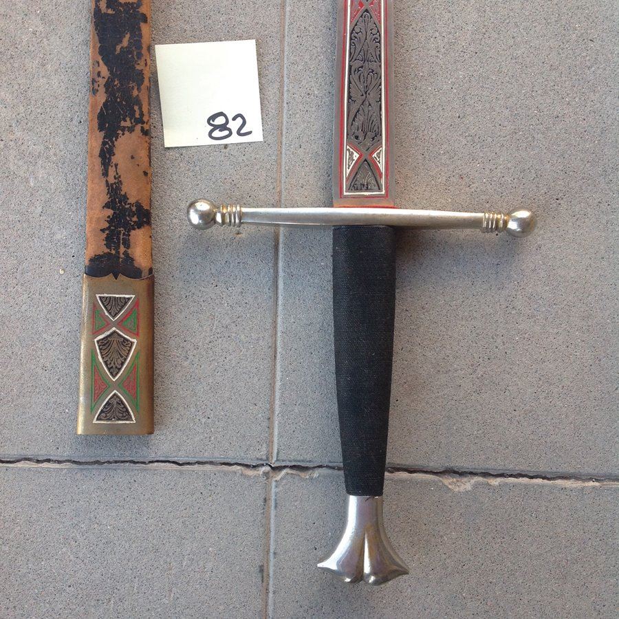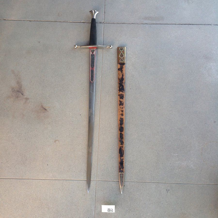 Two-handed medieval replica sword with matching sheath. Good condition.,,48"