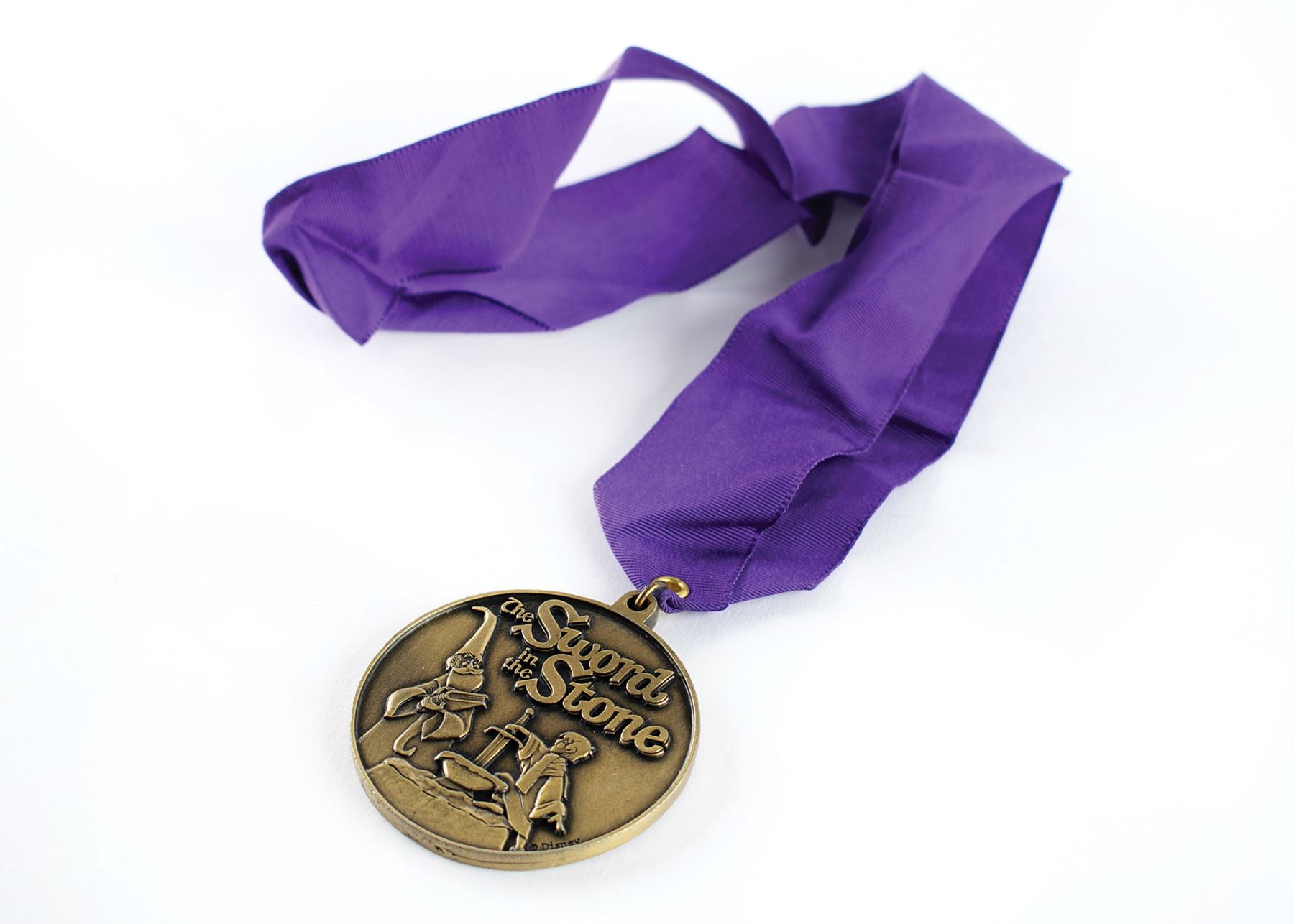 Scarce original Sword in the Stone presentation medal from Disneyland, measuring 2.5˝ in diameter, suspended from its original purple ribbon. The front features a raised image of Merlin and Arthur attempting to pull the sword from the anvil, and the reverse bears the Disneyland logo encircled with text, "The Happiest Place on Earth." In fine condition. These medals were presented during a beloved Fantasy Land ceremony to a young volunteer at the park who would help Merlin remove the sword and be proclaimed 'Ruler of the Realm.' Medals from this now defunct ceremony were not available for sale at any of the parks and are now quite uncommon.