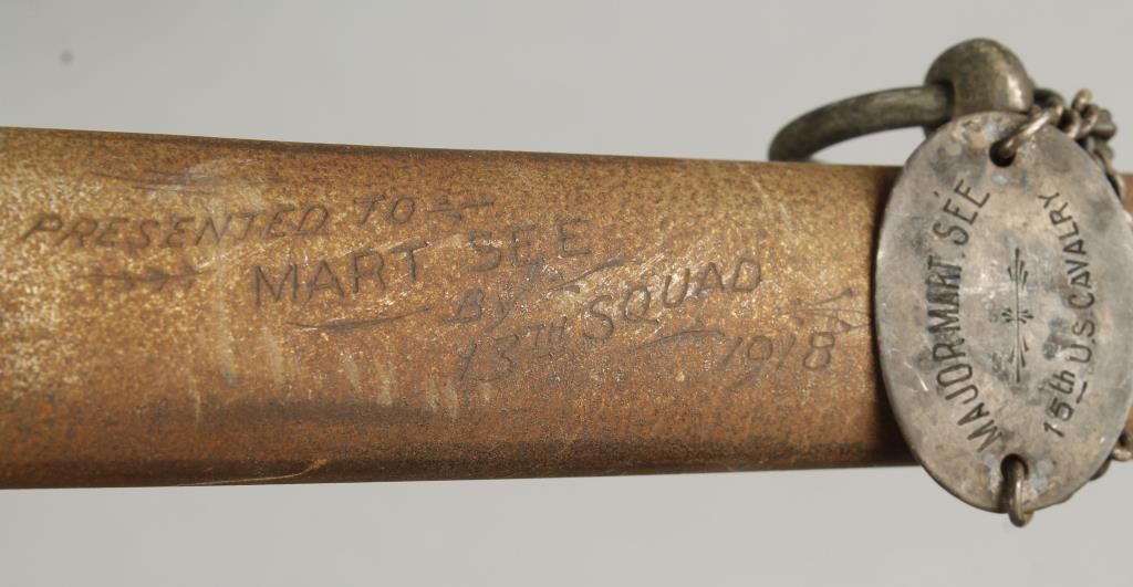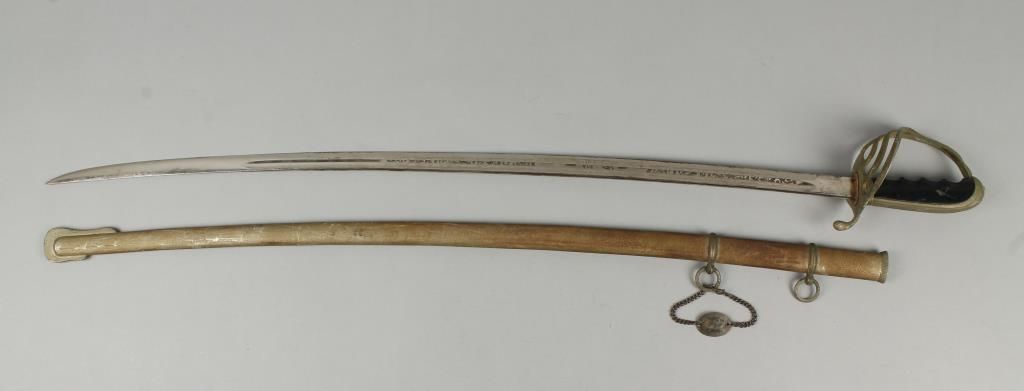 Knights of Columbus, etched blade which reads "Mart See", brass guard, includes scabbard.