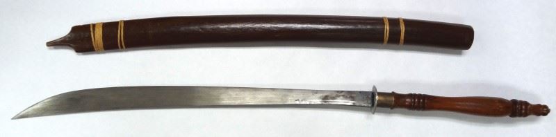 Sword with Wooden Handle and Wooden Sheath. Roping detailing on Sheath. Blade length: 23". EST:$50-$75