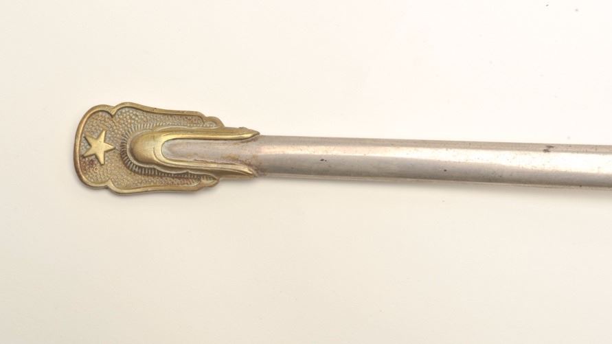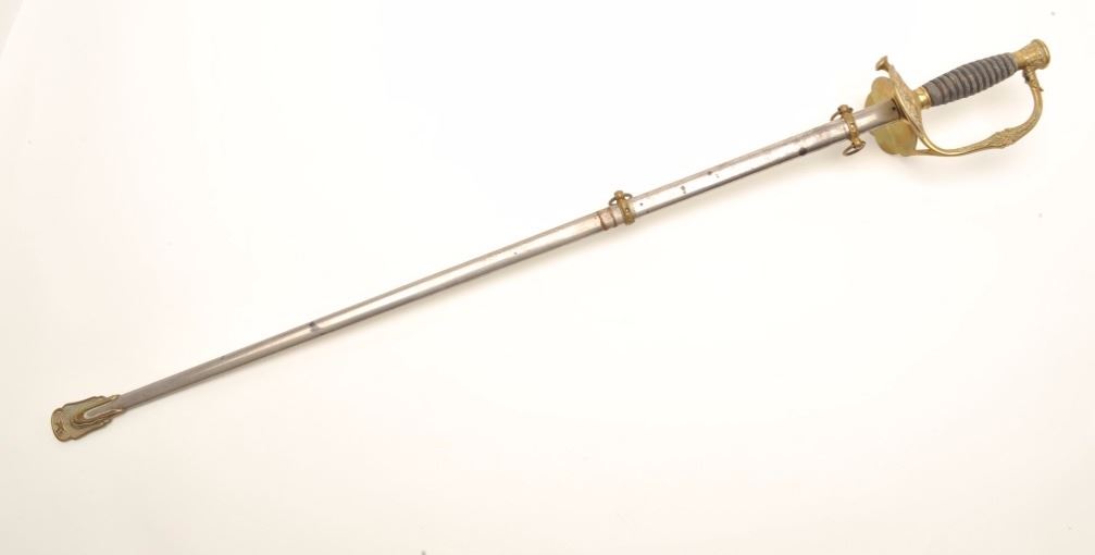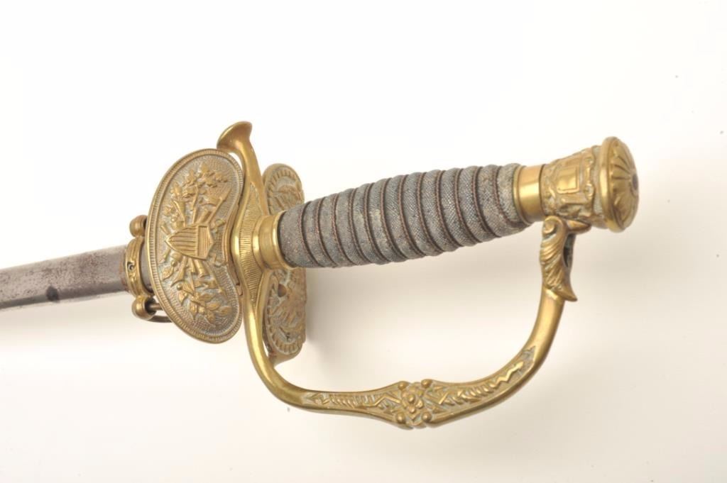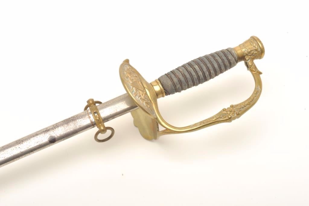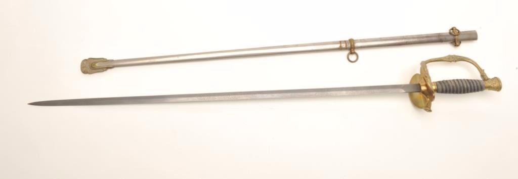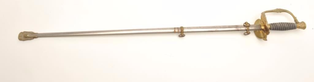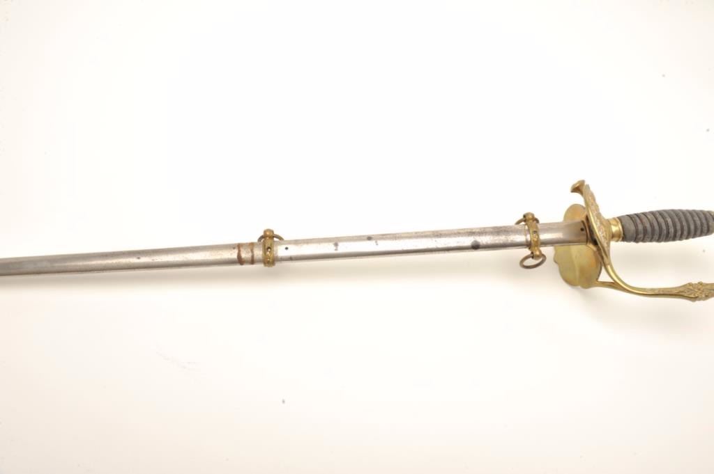 Sword with metal scabbard, brass guard and wire wrapped rayskin grip by Pettibone & Co., Cincinnati, Ohio, fair + overall with etched blade. Est.: $150-$300.