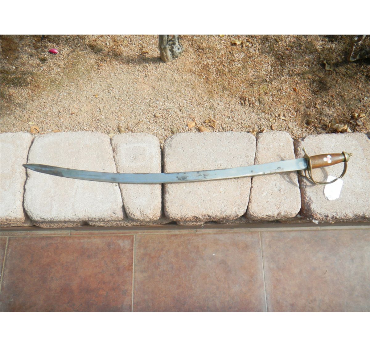 Sword from India measuring approximately 36 inches overall with the blade engraved and wood and brass handle. Circa 1960. Shipping $18.00 Fair Condition. Blade is not totally straight.