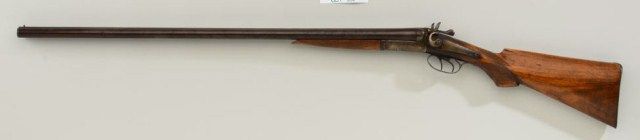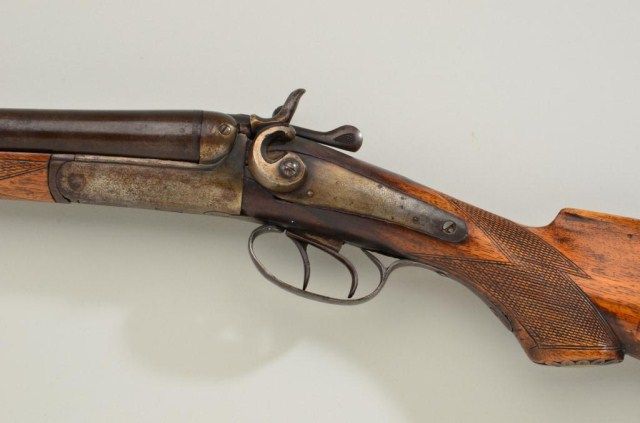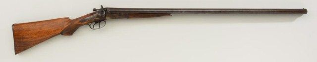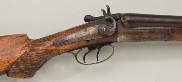 SxS back action locks shotgun marked “Competitor”, 12 gauge, 32” Damascus patterned barrels, brown and case finish, checkered wood stocks, #2405. This gun is in overall good condition showing a brown patina on barrels with some scattered erosion, silver toning to receiver and lock plates, good bores, actions and markings; wood stocks are overall good with scattered old mars and scratches from storage; checkered steel butt plate. Est.: $300-$600.