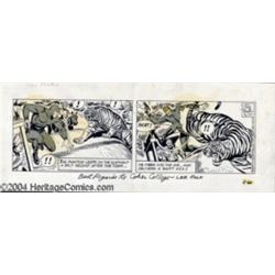 <B>Sy Barry - The Phantom Daily Comic Strip Original Art, dated 12-17-73 (King Features Syndicate, 1973).</B></I> Lee Falk's "Ghost Who Walks" never ceases to amaze, as he appears from nowhere to ward off a tiger attack. Fantastic jungle action on this slickly inked daily. Sy Barry extended the legacy of <I>The Phantom</B></I> in the sixties through the mid-nineties with his superb artistry. In a recent interview with <B>Alter-Ego's</B></I> Jim Amash, Sy revealed, "<I>The Phantom</B></I> deserved an illustrator and not a cartoonist. I spotted more blacks in the art, making it more dynamic and graphic, so that it stood out more on the printed page. I wanted to play up the unusual mystery and fantasy elements that the strip needed." The image area of the daily is 15" x 4.5". There are a few light glue stains on the daily; otherwise the art is in Very Good condition. Writer and co-creator Lee Falk has inscribed and signed the daily in the bottom border, "Best regards to Coker College -- Lee Falk." <BR><BR><B>Important notice:</B> Heritage usually auctions material at the rate of 200-250 lots per hour. On some occasions eBay Live bid software or the Internet may not be able to keep up with the pace of the auction. We recommend placing a realistic absentee bid now as insurance to avoid disappointment. Occasionally the auctioneer may eliminate or reject an eBay Live bid, and the auctioneer may also reopen a lot after the close of the eBay live bidding (usually because we missed an audience bid), and may reject your bid even if it shows you as the winning bidder. By bidding via eBay Live, you agree that Heritage may award the lot to another bidder at its sole discretion under the circumstances described above or any other reasonable circumstances. Since eBay bids are not shown to us until we open the lot on the floor, we treat those bids just like floor bids. In most cases the floor responds before the eBay bid is presented to us, due to Internet lag time, so for consistency we have made it a policy that floor bids are always considered first over tie eBay live bids. Also please note that all Heritage lots purchased through eBay Live carry a 20% Buyer's Premium. Please make sure you read the Terms and Conditions before you bid.