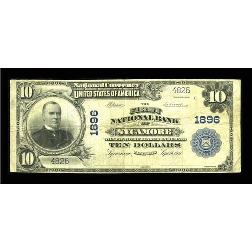 <B>Sycamore, IL</B></I> - $10 1902 Plain Back Fr. 628 <B>The First NB</B></I> Ch. # 1896<BR>The second title used by this much collected bank, which is none too common in large with either title. Pleasing <B>Fine.</B></I><BR><I>From The Lincoln Collection</B></I><BR><BR><b>Shipping:</b> Coins & Currency (<a target="_blank" href="http://www.heritageauctions.com/common/shipping.php">view shipping information</a>)