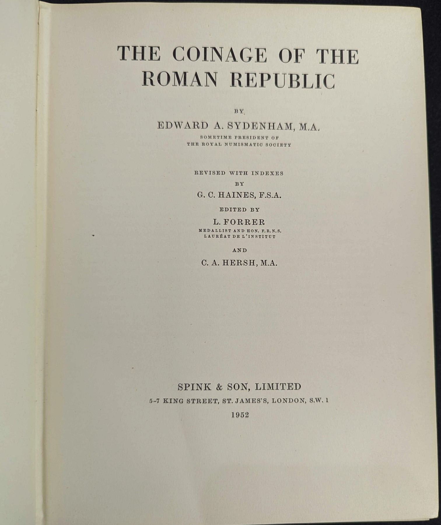 Sydenham, Edward A. MA, G.C. Haines F.S.A et al. (Eds.). THE COINAGE OF THE ROMAN REPUBLIC. Spink & Son Ltd. 1952. 4to. lxix, 343 pages. London. First edition. original blue cloth, gilt. 30 fine plates. Fine. This book is the only realistically proved volume on the subject of the coinage of the Roman Republic. It includes 30 full page high quality black and white coin plates in full size that depict over 1369 coins. Collectors and dealers regularly use the Sydenham numbers provided in this book. Clain-Stefanelli 3745*. Lot weight: 3 lbs 4oz. Subject(s): Ancient Coinage.