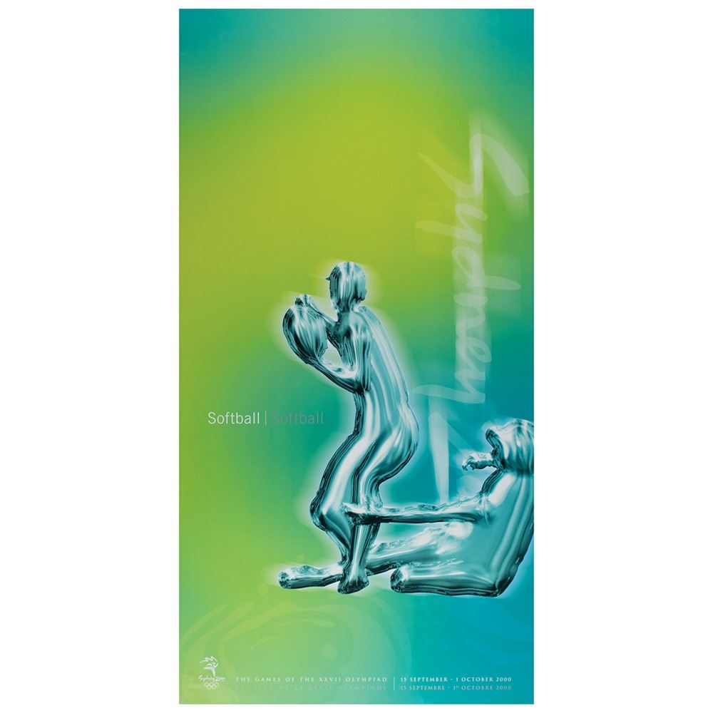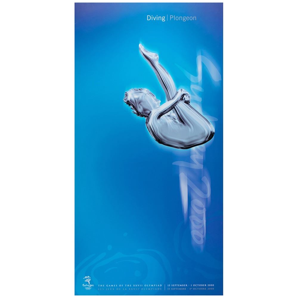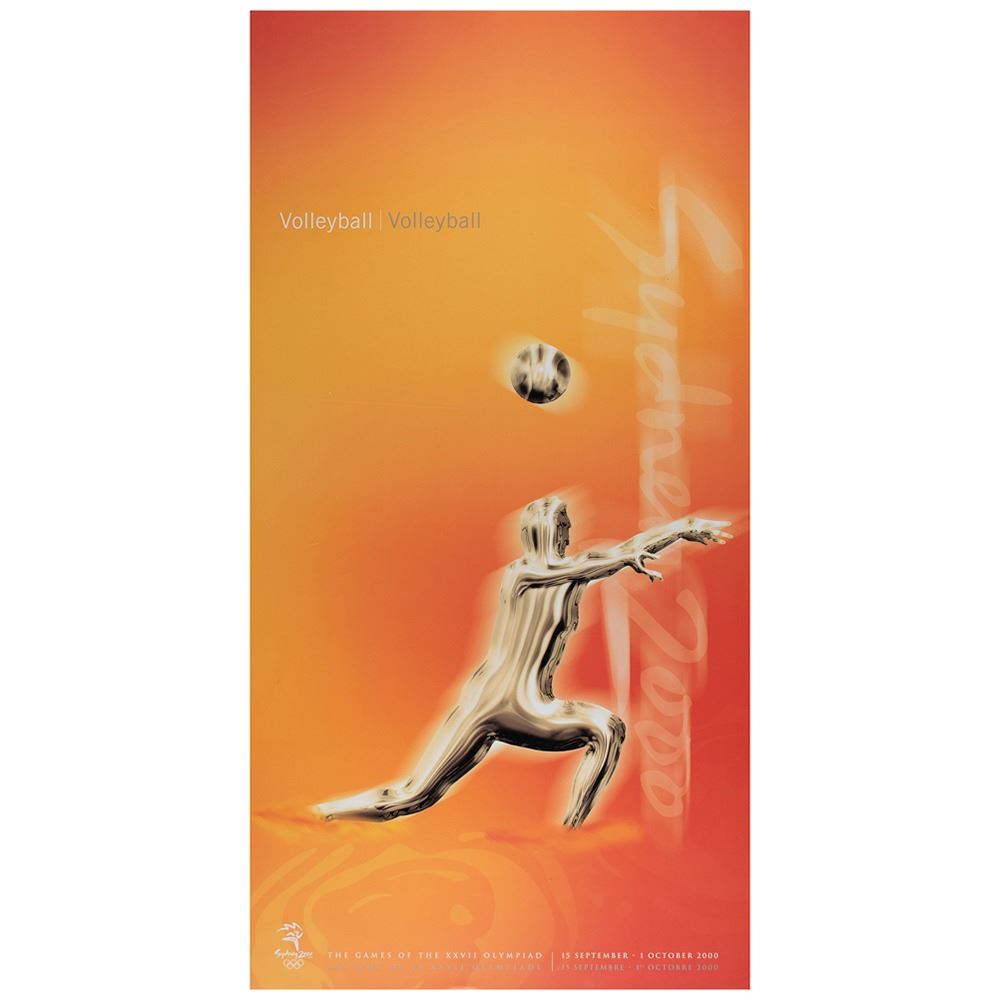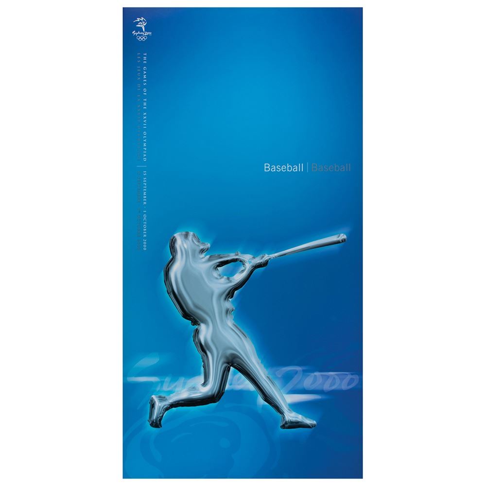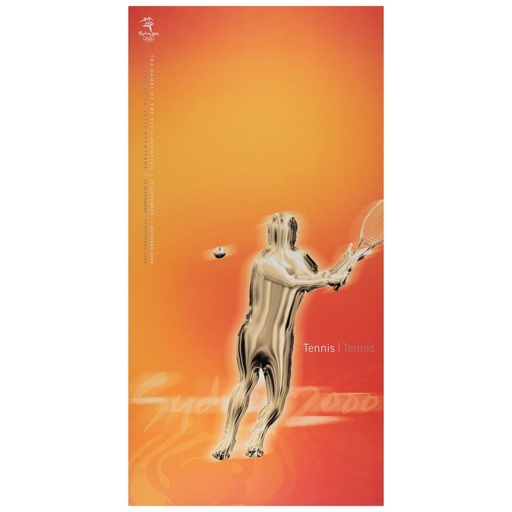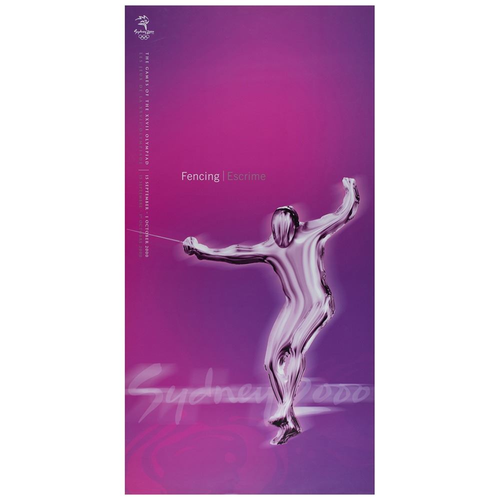 Colorful collection of 31 event posters from the Sydney 2000 Summer Olympics, each measuring 17Ë x 33Ë and featuring stylized metallic images of the Olympic sport, including: Archery, Athletics, Badminton, Baseball, Basketball, Boxing, Canoe/Kayak, Cycling, Diving, Equestrian, Fencing, Football, Gymnastics, Handball, Hockey (Field), Judo, Modern Pentathlon, Rowing, Sailing, Shooting, Softball, Swimming, Synchronized Swimming, Table Tennis, Taekwondo, Tennis, Triathlon, Volleyball, Water polo, Weightlifting, and Wrestling. In overall fine condition, with some light wear or bends to corners or edges. These posters were used in the venues for decorative purposes and were not offered for retail sale.