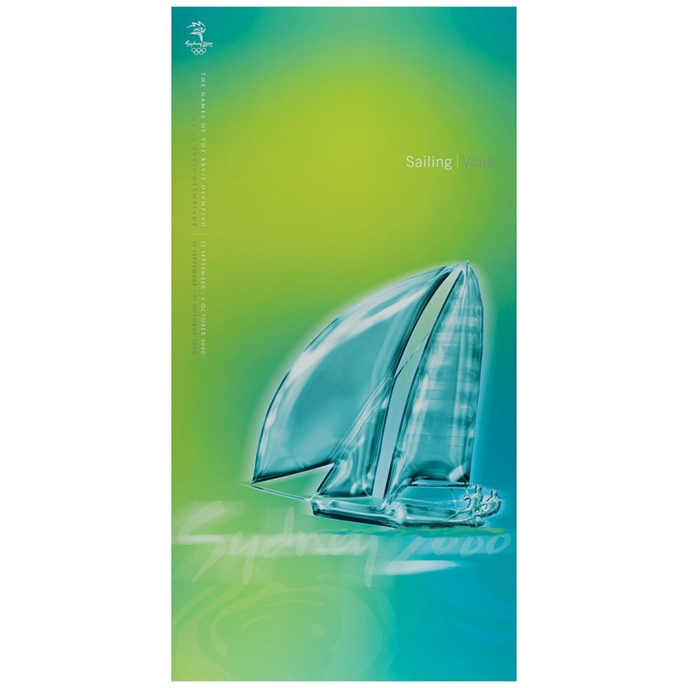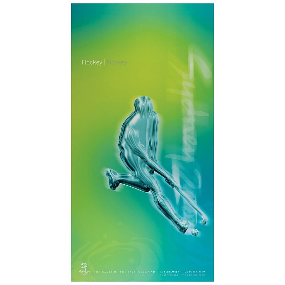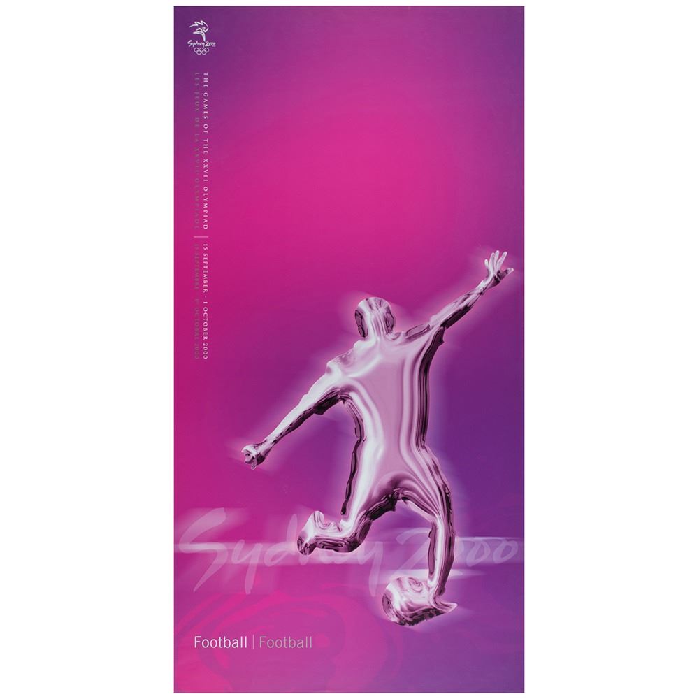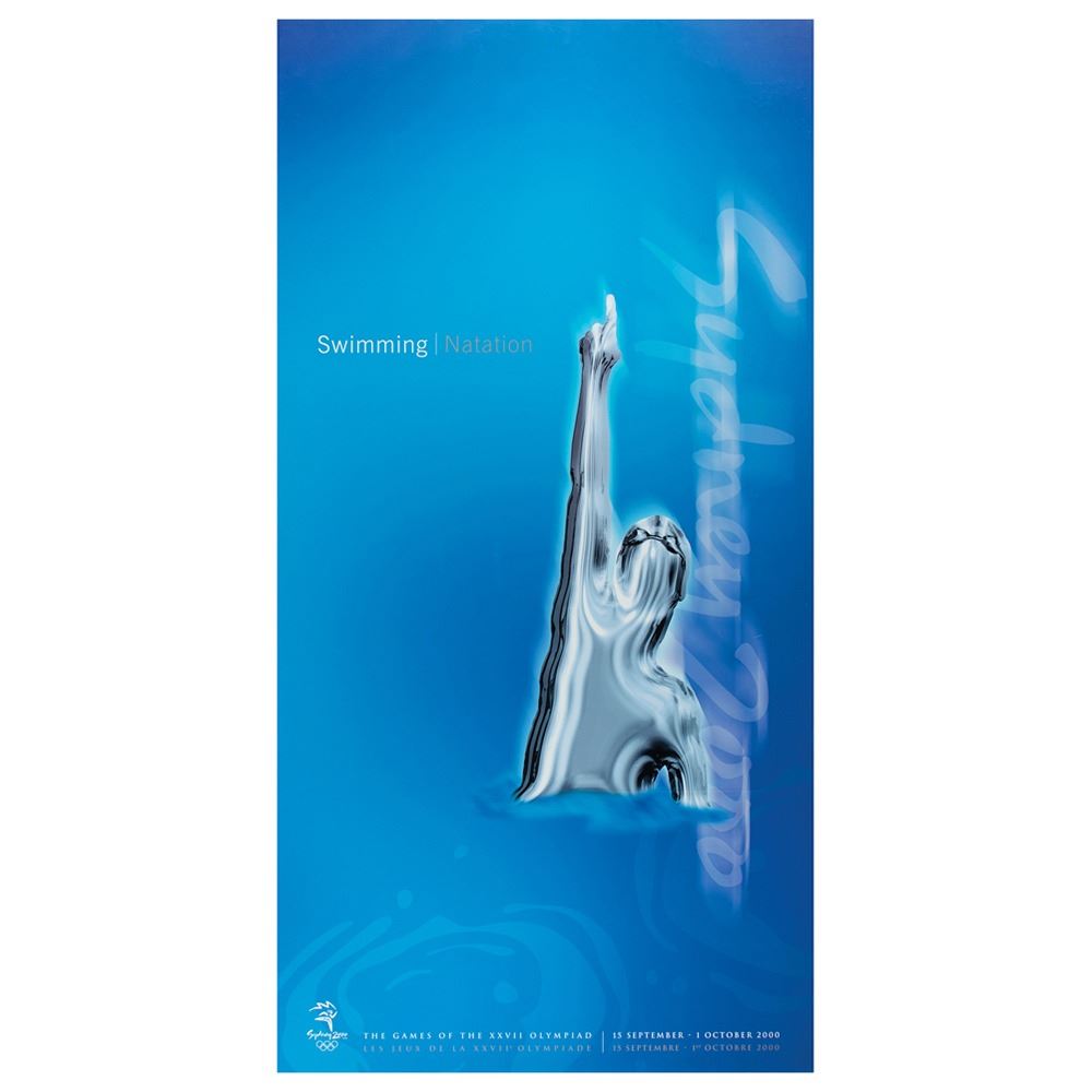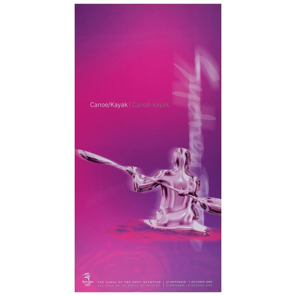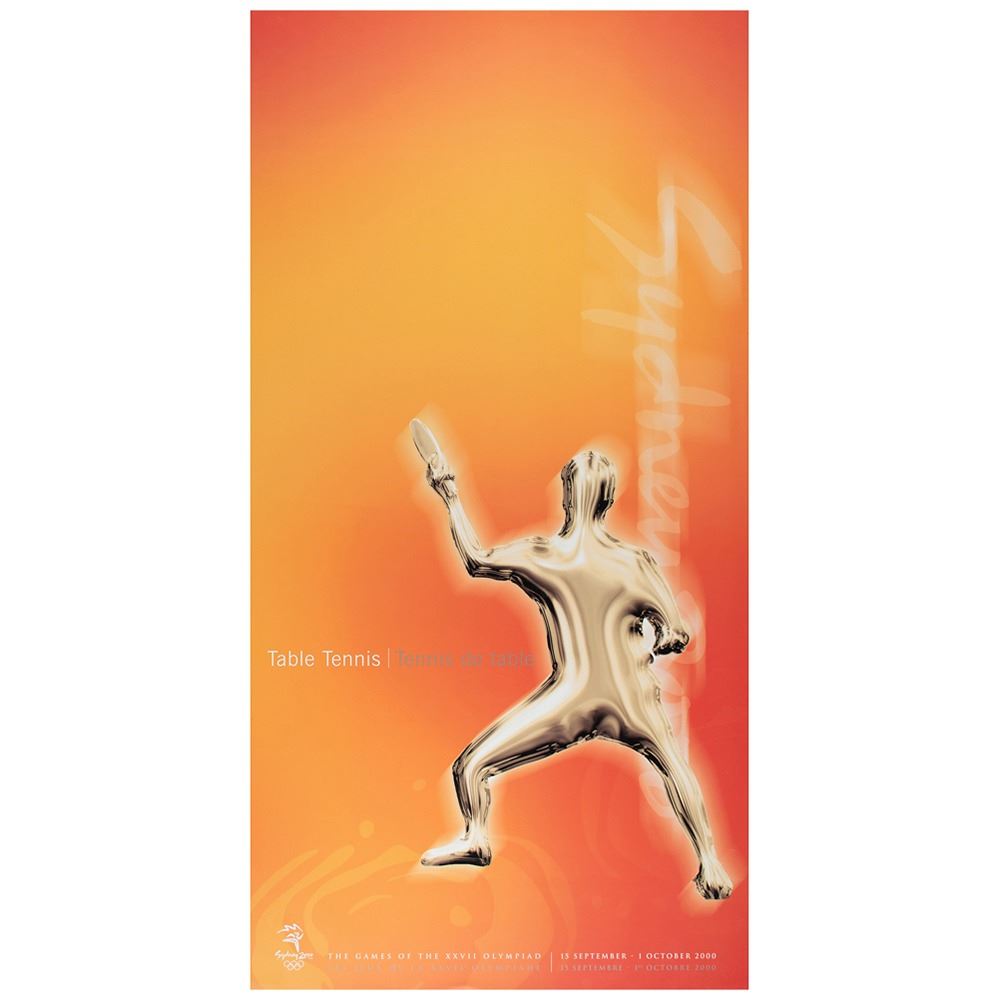 Colorful collection of 31 event posters from the Sydney 2000 Summer Olympics, each measuring 17Ë x 33Ë and featuring stylized metallic images of the Olympic sport, including: Archery, Athletics, Badminton, Baseball, Basketball, Boxing, Canoe/Kayak, Cycling, Diving, Equestrian, Fencing, Football, Gymnastics, Handball, Hockey (Field), Judo, Modern Pentathlon, Rowing, Sailing, Shooting, Softball, Swimming, Synchronized Swimming, Table Tennis, Taekwondo, Tennis, Triathlon, Volleyball, Water polo, Weightlifting, and Wrestling. In overall fine condition, with some light wear or bends to corners or edges. These posters were used in the venues for decorative purposes and were not offered for retail sale.