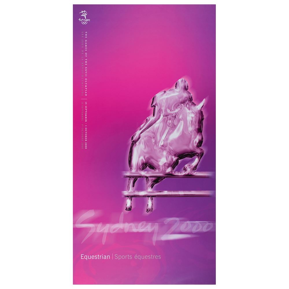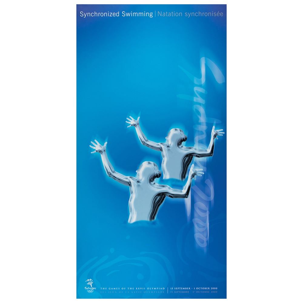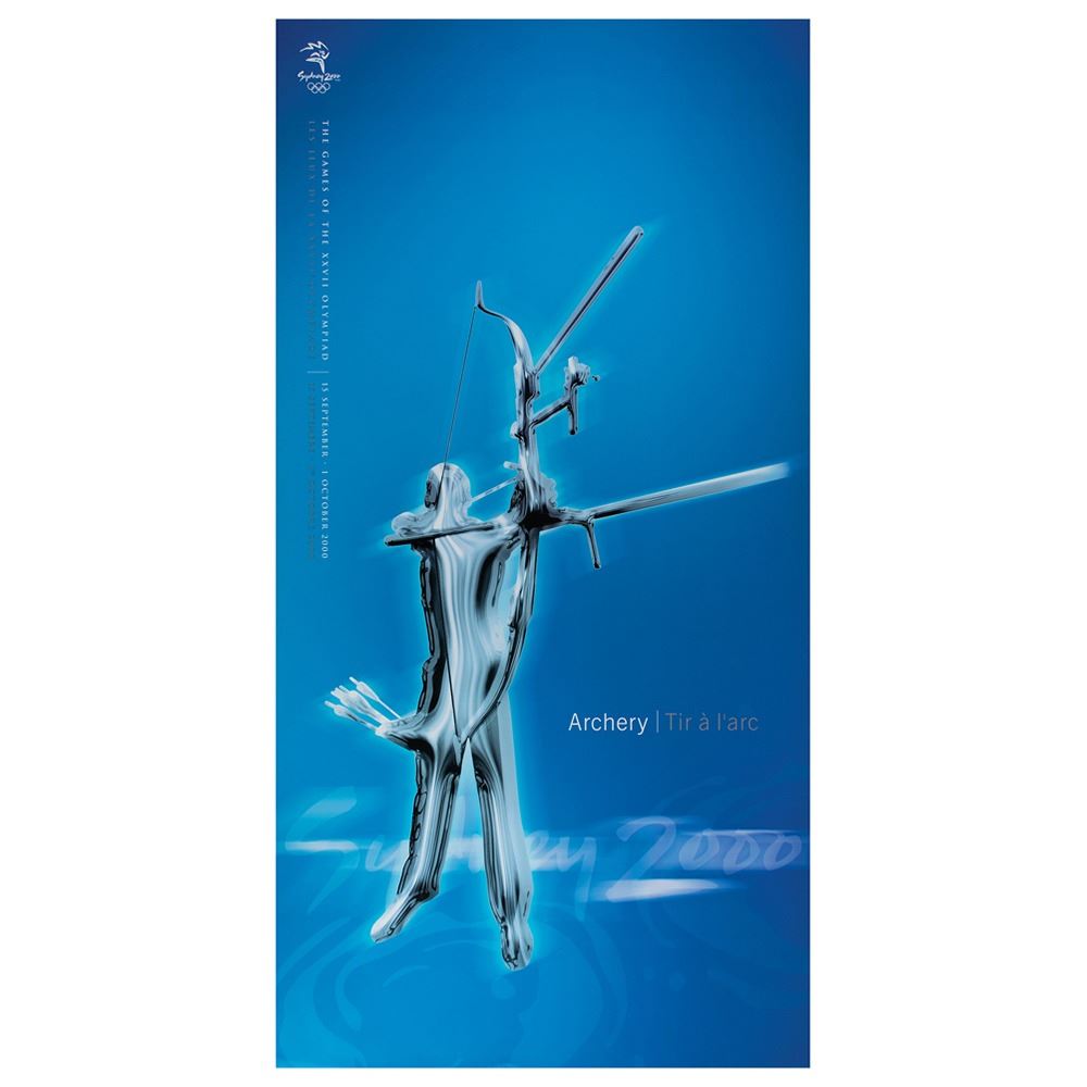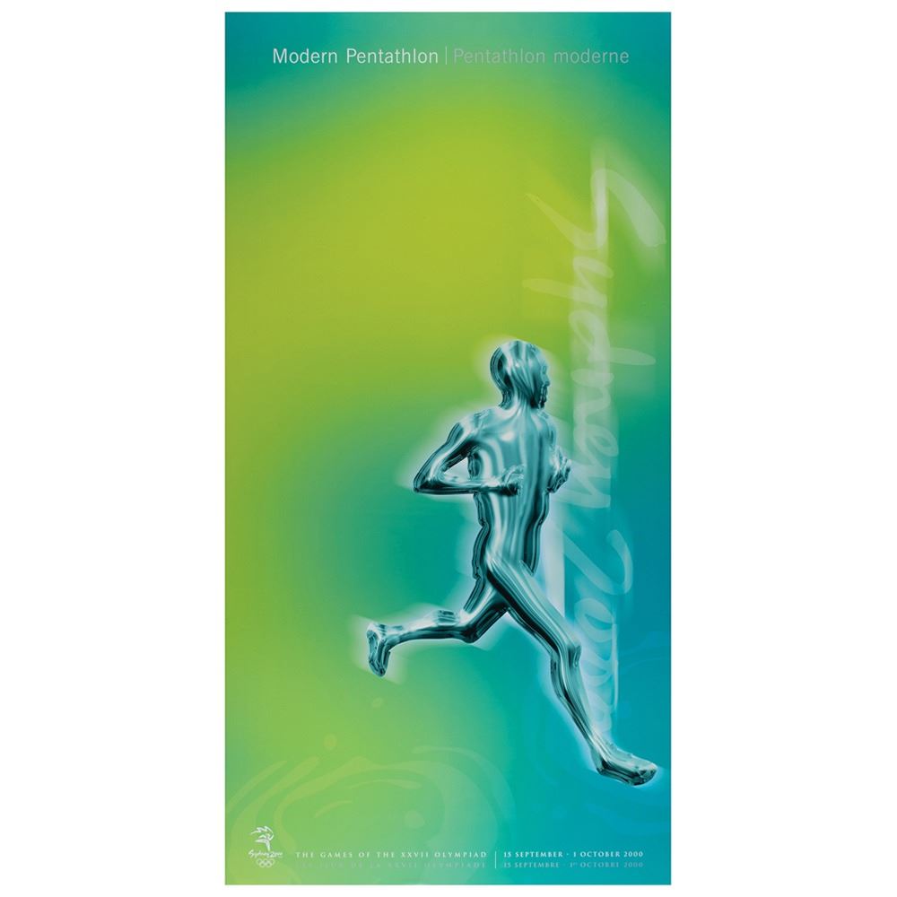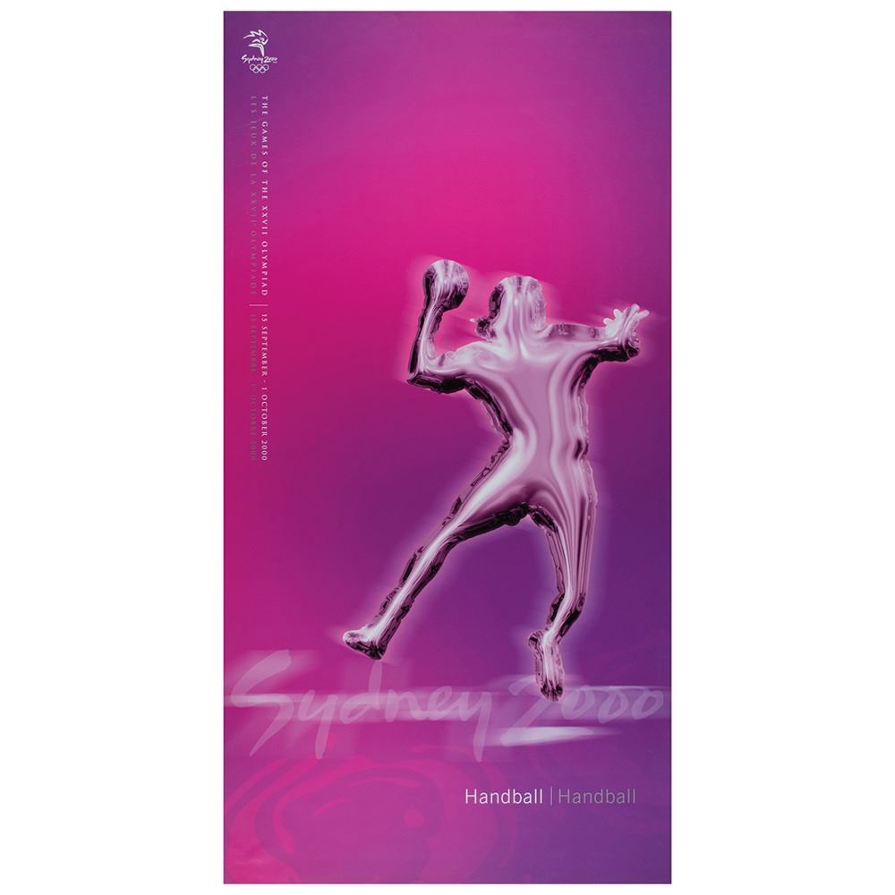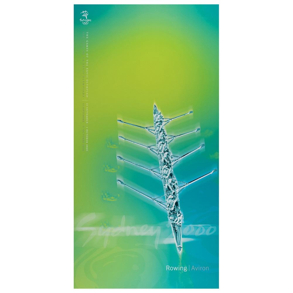 Colorful collection of 31 event posters from the Sydney 2000 Summer Olympics, each measuring 17Ë x 33Ë and featuring stylized metallic images of the Olympic sport, including: Archery, Athletics, Badminton, Baseball, Basketball, Boxing, Canoe/Kayak, Cycling, Diving, Equestrian, Fencing, Football, Gymnastics, Handball, Hockey (Field), Judo, Modern Pentathlon, Rowing, Sailing, Shooting, Softball, Swimming, Synchronized Swimming, Table Tennis, Taekwondo, Tennis, Triathlon, Volleyball, Water polo, Weightlifting, and Wrestling. In overall fine condition, with some light wear or bends to corners or edges. These posters were used in the venues for decorative purposes and were not offered for retail sale.