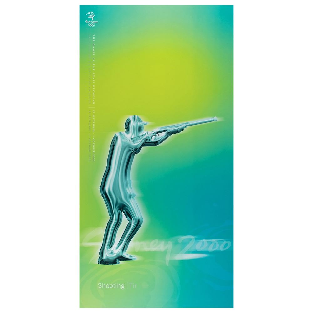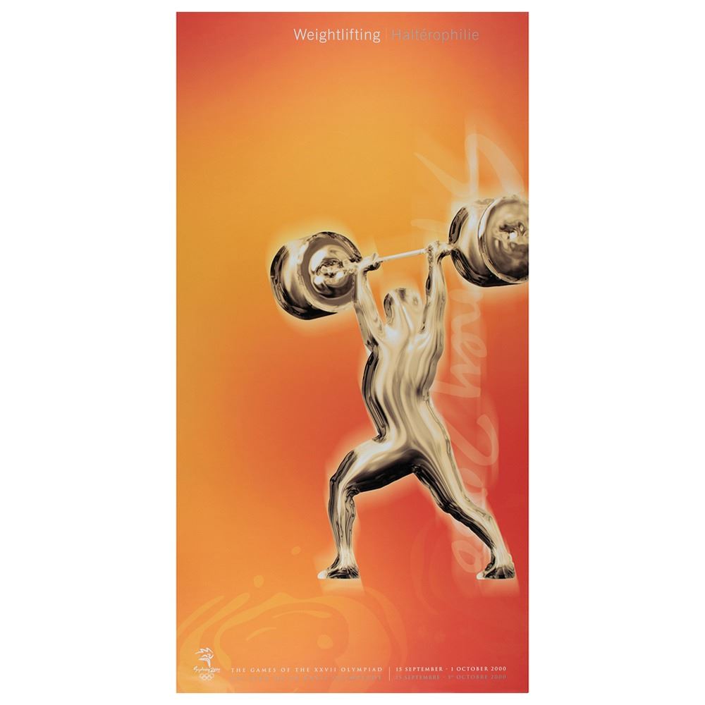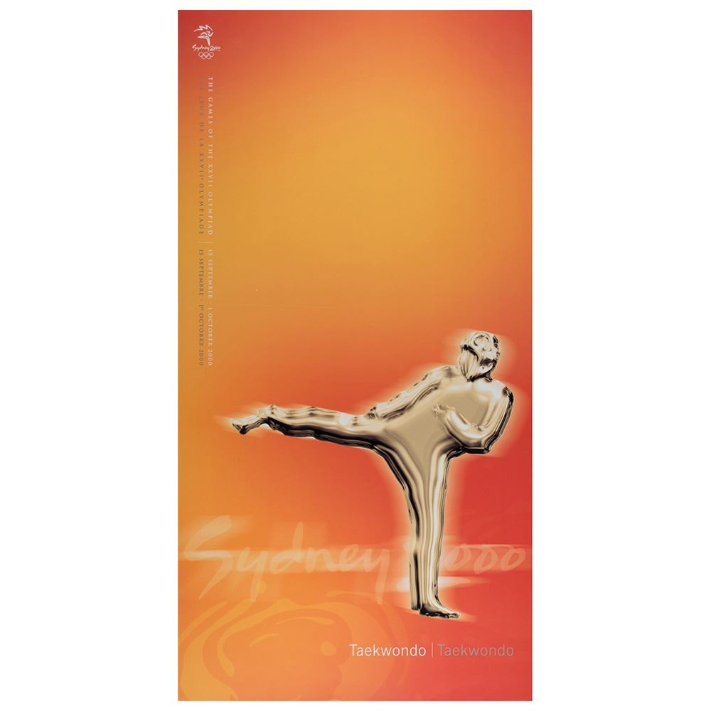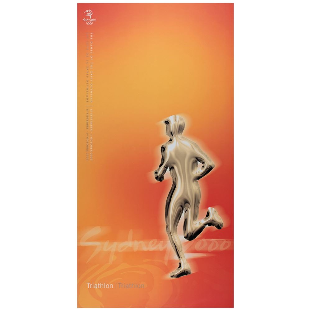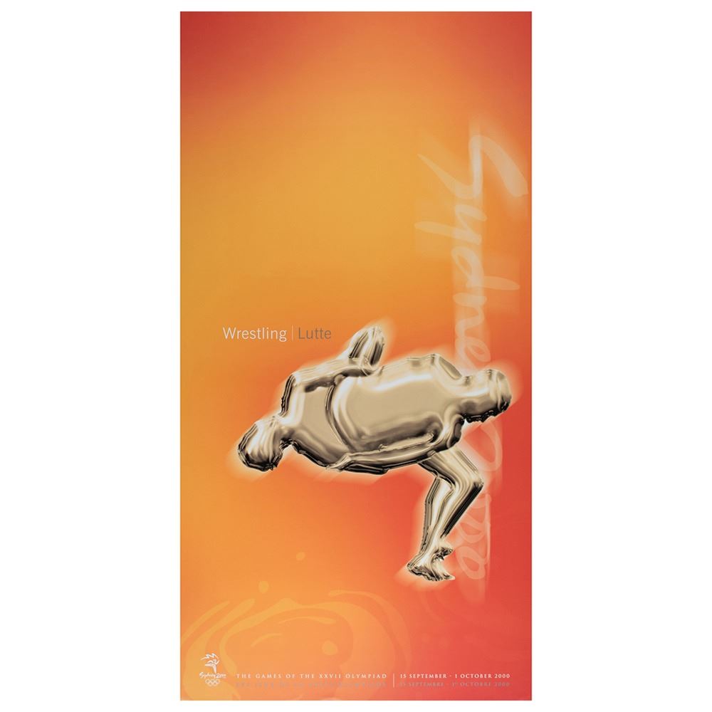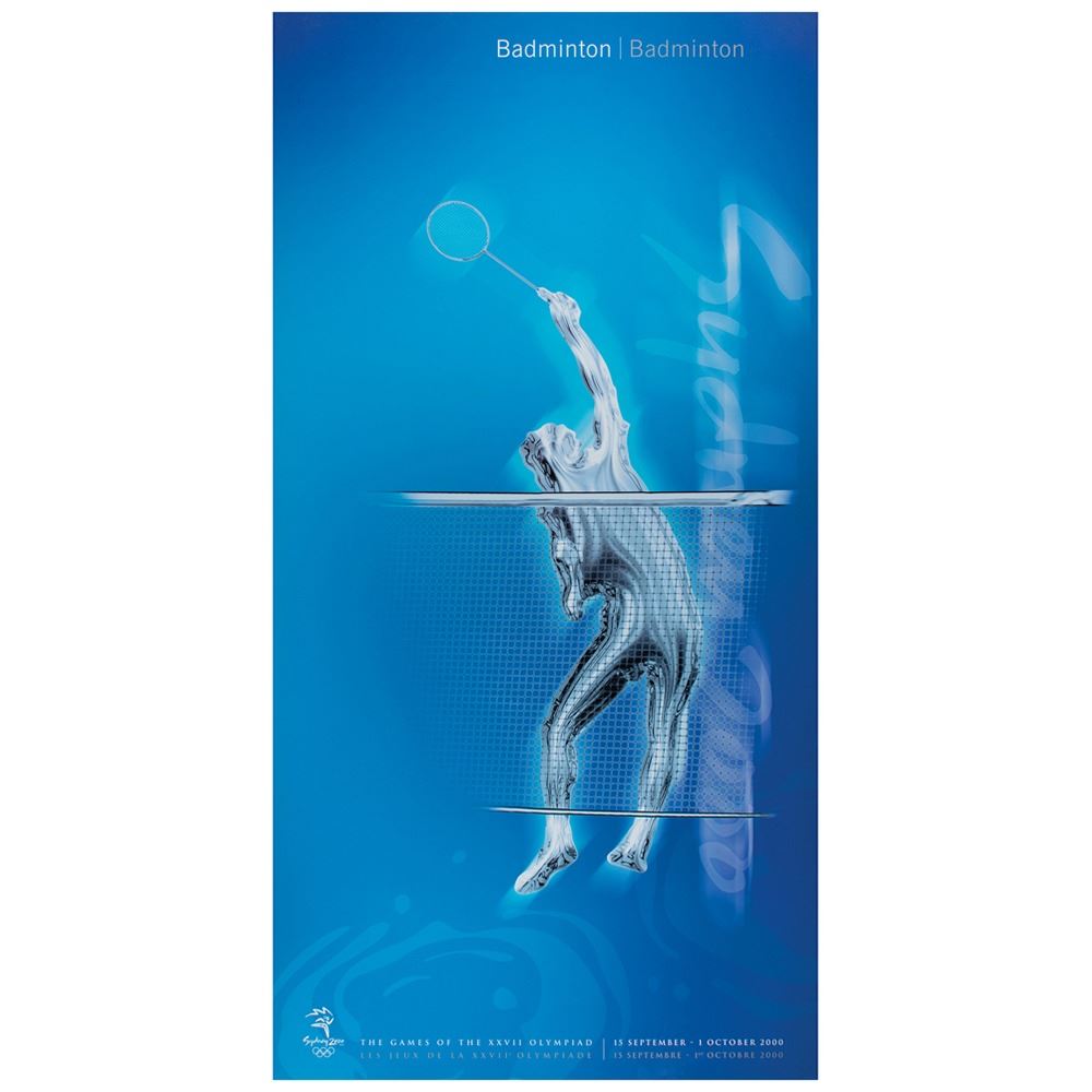 Colorful collection of 31 event posters from the Sydney 2000 Summer Olympics, each measuring 17Ë x 33Ë and featuring stylized metallic images of the Olympic sport, including: Archery, Athletics, Badminton, Baseball, Basketball, Boxing, Canoe/Kayak, Cycling, Diving, Equestrian, Fencing, Football, Gymnastics, Handball, Hockey (Field), Judo, Modern Pentathlon, Rowing, Sailing, Shooting, Softball, Swimming, Synchronized Swimming, Table Tennis, Taekwondo, Tennis, Triathlon, Volleyball, Water polo, Weightlifting, and Wrestling. In overall fine condition, with some light wear or bends to corners or edges. These posters were used in the venues for decorative purposes and were not offered for retail sale.
