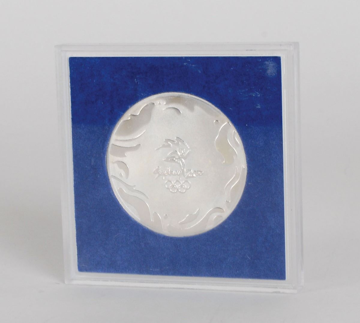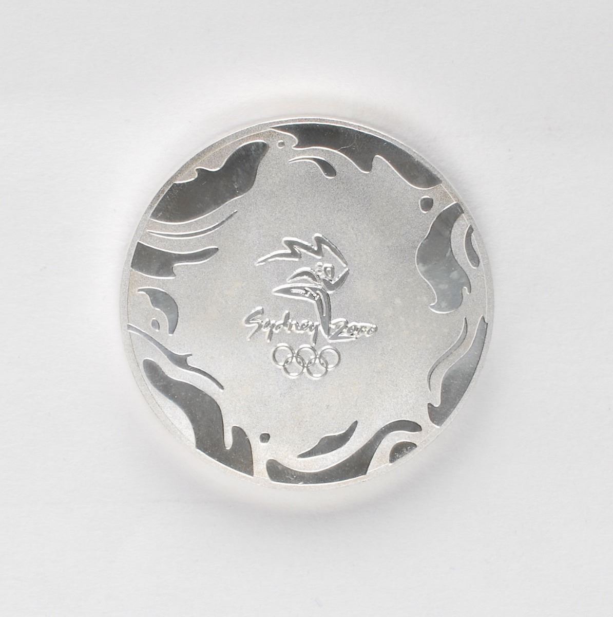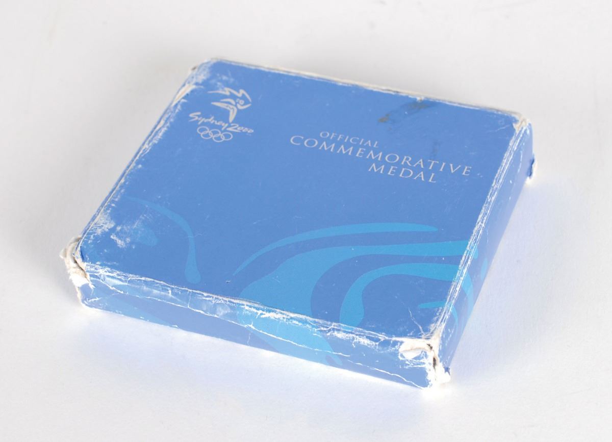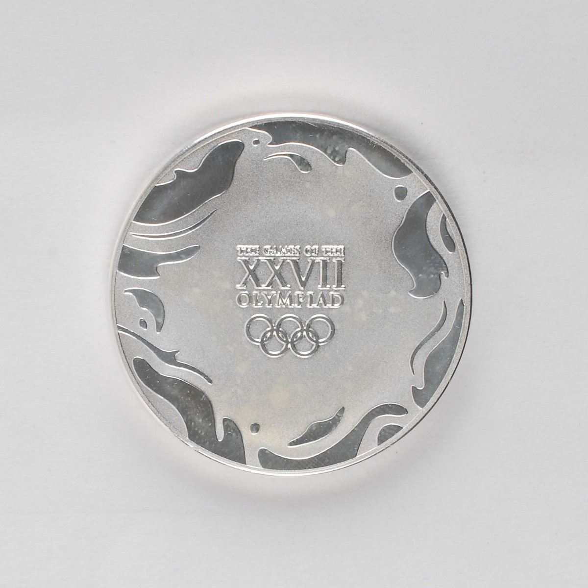 Participation medal issued for the Sydney 2000 Summer Olympics. Silver-colored, 50 mm, 69 gm. The front depicts the Sydney Games logo and Olympic rings, and the reverse bears raised text, “The Games of the XXVII Olympiad,” with the rings below; both sides are encircled with a fluid energy motif, a concentric design developed by FHA Image Design intended to symbolize the Olympic rings reflected in Sydney Harbor. Complete with its original plastic case and paper box.