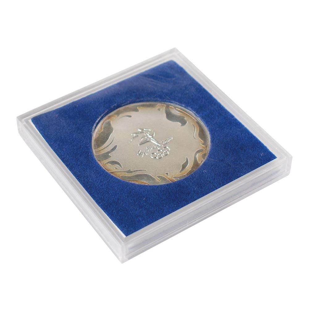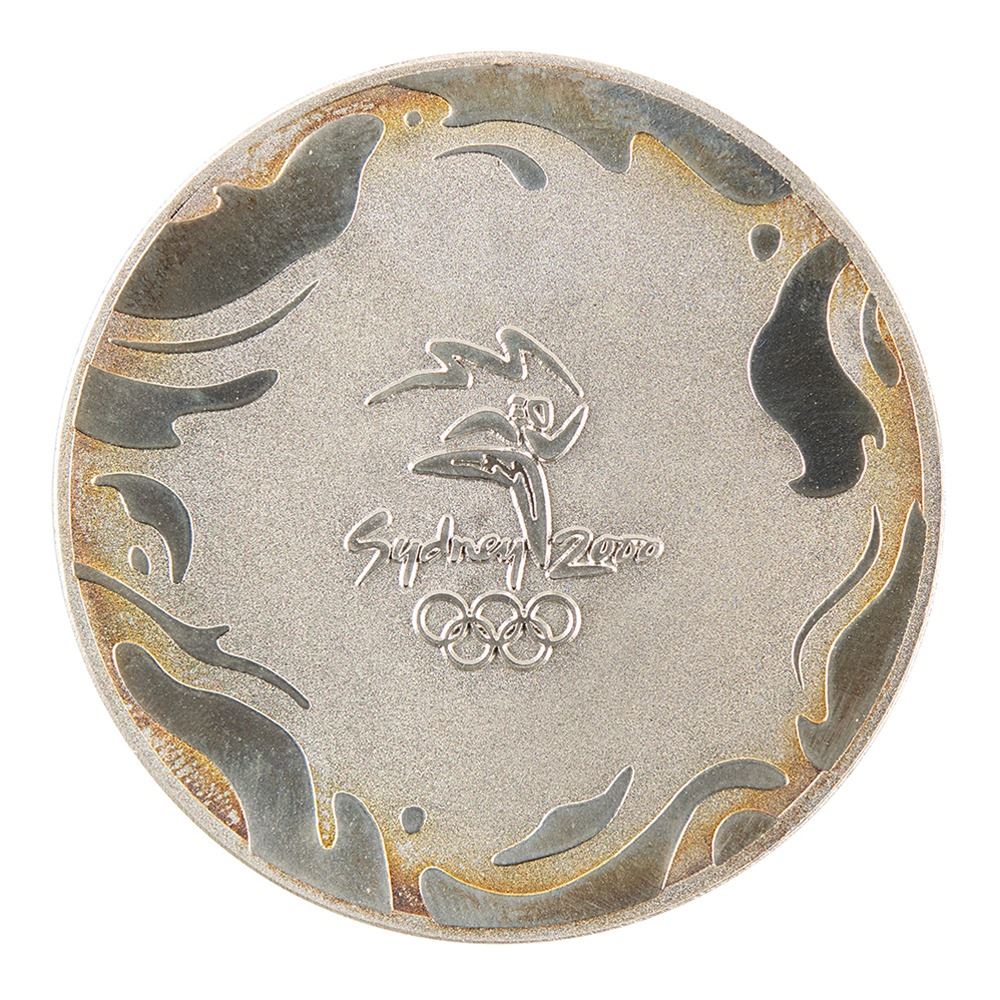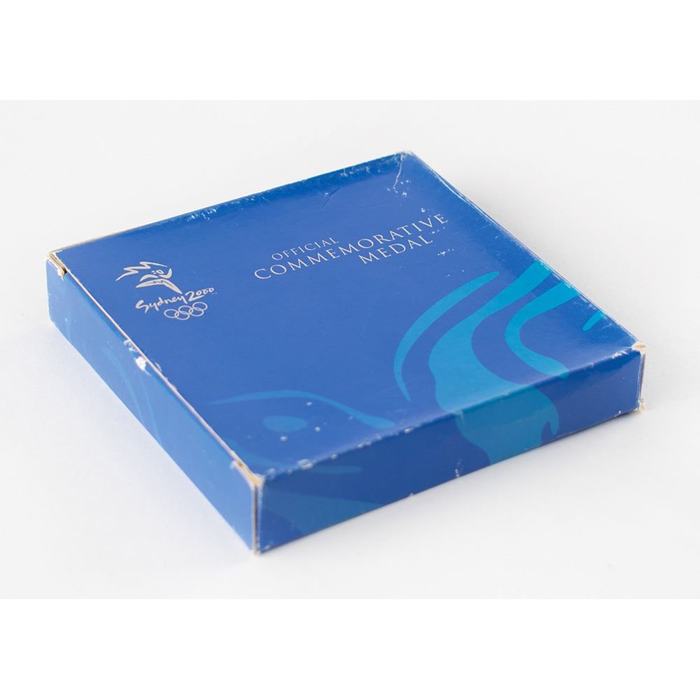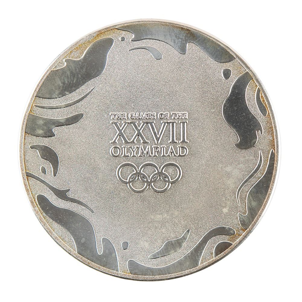 Participation medal issued for the Sydney 2000 Summer Olympics. Silver-colored, 50 mm, 69 gm. The front depicts the Sydney Olympic emblem surrounded by the 'fluid energy' motif used for the Games; the reverse bears the Olympic rings and reads, "The Games of the XXVII Olympiad," surrounded by the same motif. The medal bears some toning to borders on both sides. Complete with its clear plastic case and presentation box, with some scuffs and marks to the case and box.
