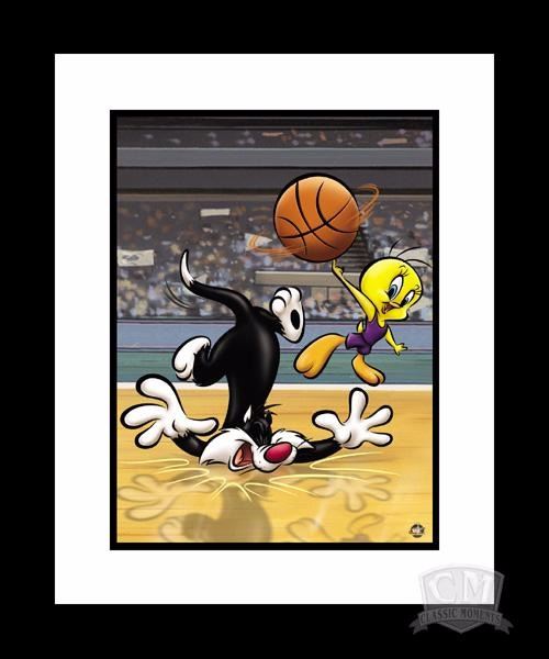 Sylvester and Tweety Basketball- A Fine Art Giclee featuring Looney Tunes characters Tweety and Sylvester. Perfect for any basketball fanatic's room. Limited Edition. Comes matted and framed with Certificate of Authenticity. Size 16x20. Edition Size 500.