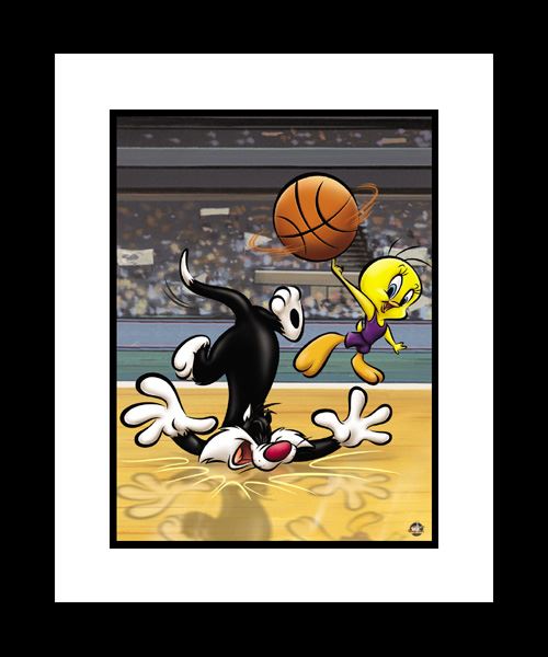 Sylvester and Tweety Basketball- A Fine Art Giclee featuring Looney Tunes characters Tweety and Sylvester. Perfect for any basketball fanatic's room. Limited Edition. Comes matted and framed with Certificate of Authenticity. Size 16x20. Edition Size 500.Looney Tunes is a Warner Bros. animated cartoon series which ran in many movie theatres from 1930 to 1969. It preceded the Merrie Melodies series and is Warner Bros.'s first animated theatrical series. The regular Warner Bros. animation cast also became known as the "Looney Tunes" “Giclée,†as a fine art term, has come to be associated with prints using fade-resistant "archival" inks (including solvent inks) and the inkjet printers that use them. These printers use the CMYK color process but may have multiple cartridges for variations of each color based on the CcMmYK color model .