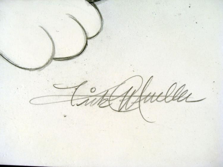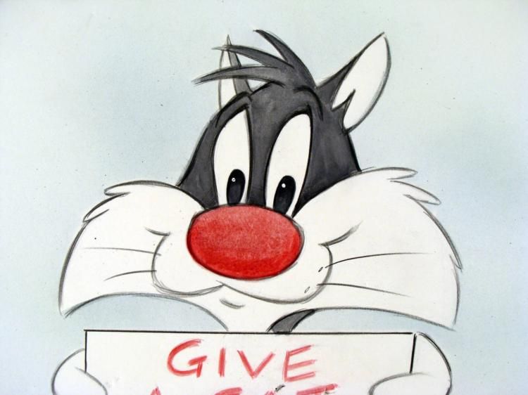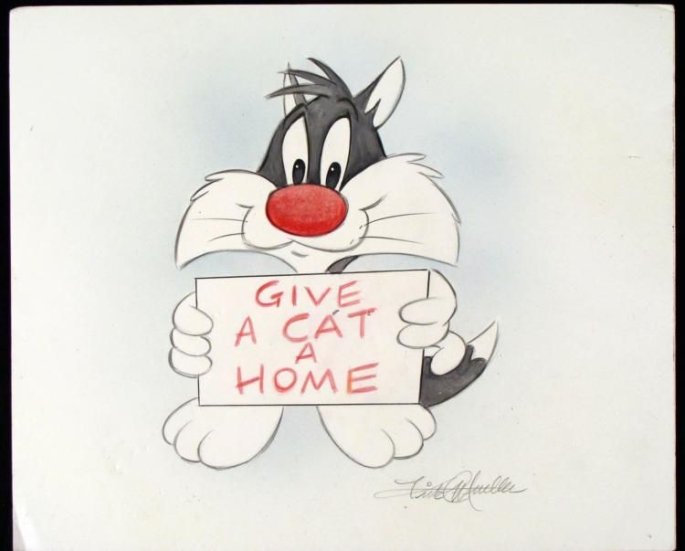 Sylvester the cat is looking for a home. He is holding up a sign that reads, "Give A Cat A Home." Sylvester is from the production of the "Looney Tunes Show." The drawing was signed by Kirk Mueller. * * * Original Animation DrawingOverall Size of Drawing: 14" x 17" * * Condition: Very Good * * * Traditional animation is a multi-step process which includes various types of art techniques. Drawings are a key part of the process, in which the animator creates the design and movement of the characters. Drawings are then transferred onto acetate cels * (by hand-inking and/or photo copying) to create a production cel, which is then hand painted on the back side, using paint colors chosen and approved by the creator of the series. * *