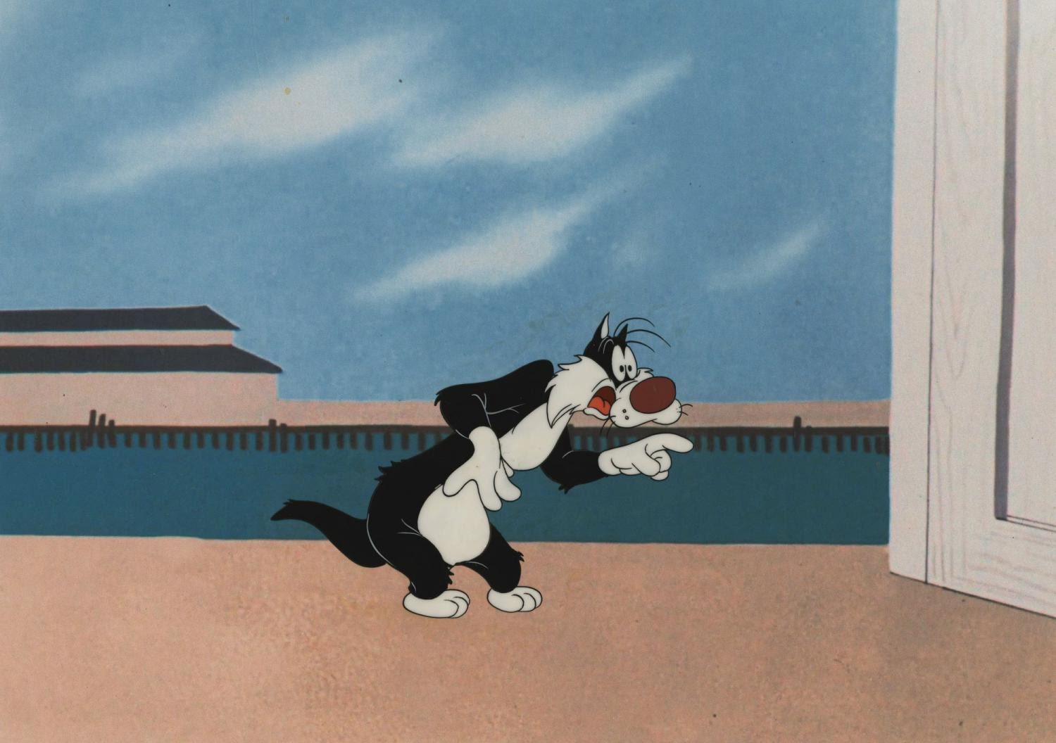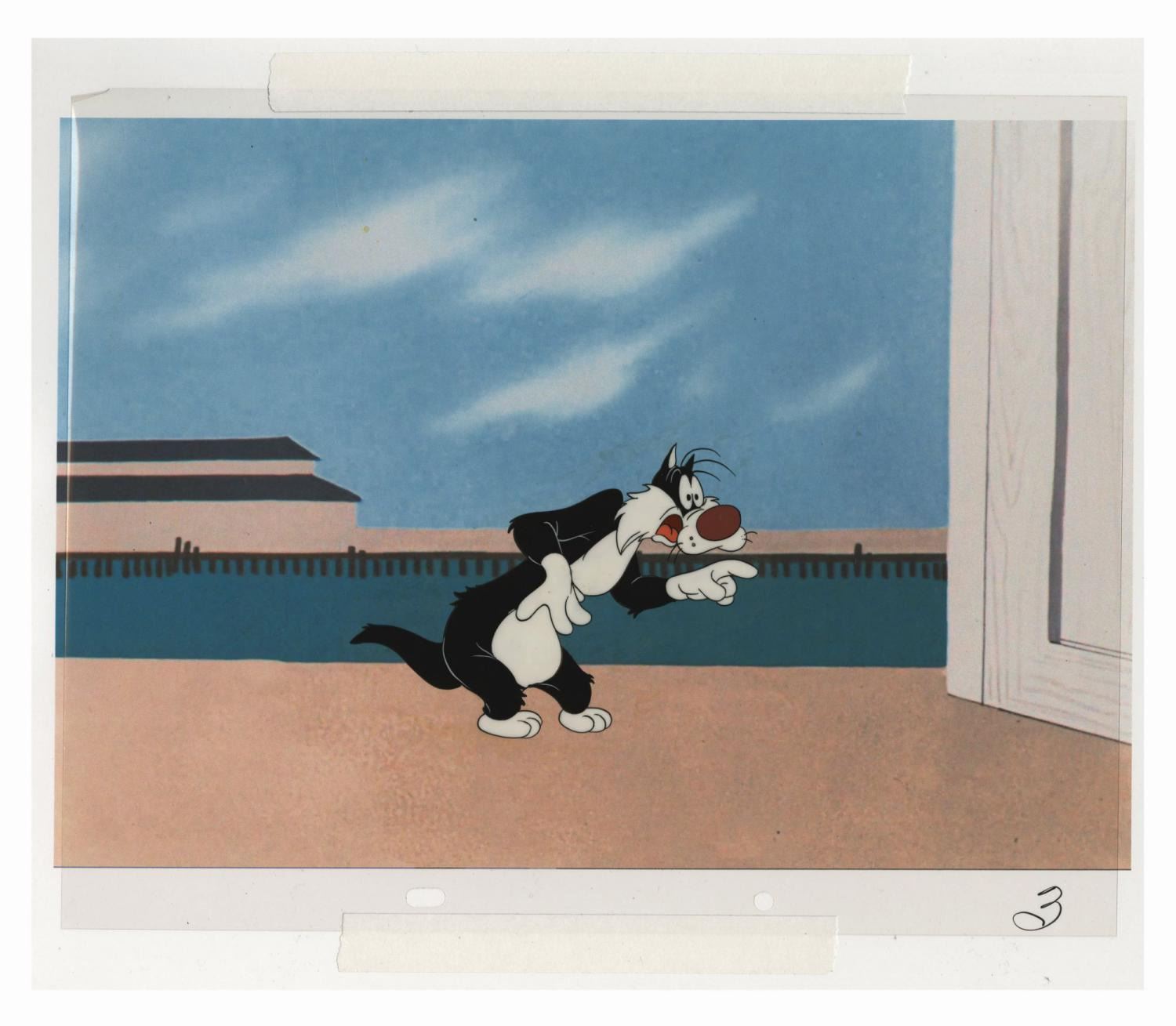 (Warner Bros., 1952) An original hand-painted production cel of Sylvester from the Looney Toons animated short "Hoppy Go Lucky." Archivally taped to a printed reproduction background, the cel depicts Sylvester, startled from his encounter with Hippety Hopper. The cel has an image size of 3.5"x5" on the 10”x12.5” cel sheet. It is in very good condition with a minor top right corner bend and spot of discoloration at the upper left of the cel, neither of which affect the artwork.