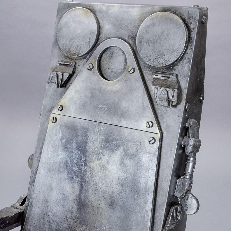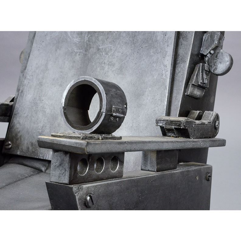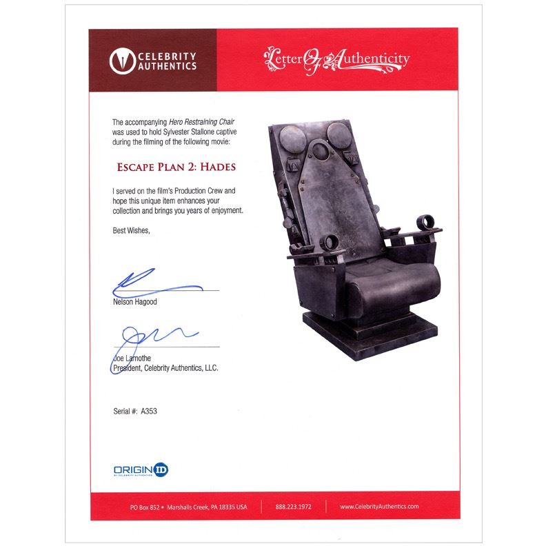 Direct from the set is Sylvester Stallone's 2018 Escape Plan 2: Hades Screen Used Hero Restraining Chair! This is the chair used in all primary scenes of Stallone being restrained and can be seen on the film's marketing and promotional posters and materials. As explained by the set decorator, only two chairs were produced (the other being destroyed) but only this one was affixed with rods into the back of the chair and features the plate screw marks on back. Customized, futuristic looking chair made of resin, plastic, wood and leather, measuring approximately 47 inches tall, 29 inches wide, 40 inches deep and sits atop a custom base making an impressive and solid unit, weighing about 150 lbs. The faux metal finish is a work of art with magnetic wrist restraints. This screen matched hero prop piece would be a focal point of any collection or museum! Includes Celebrity Authentics Letter of Authenticity personally signed by Production Crew Member verifying item's on screen use and provenance. Exact item pictured is what you will receive. *Please note that this item is available for pick up only (contact for details). Don't miss your chance to own this amazing conversation piece!