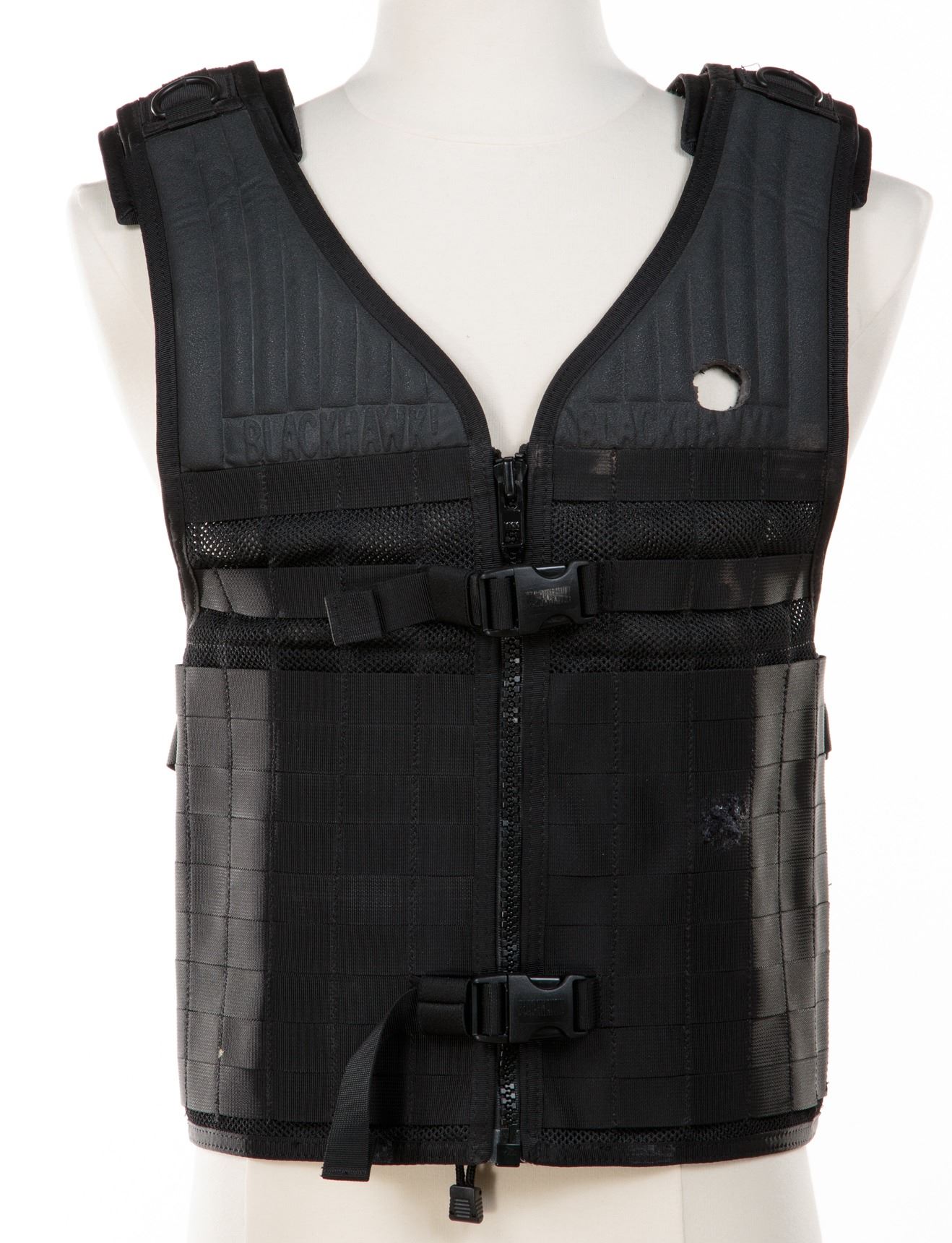 515. Sylvester Stallone "Barney Ross" Blackhawk tactical vest from The Expendables 2. (Lionsgate, 2012) Original black webbing and mesh tactical flack jacket consisting of a Blackhawk brand vest with padded foam shoulders, web belt and plastic snap buckles across a zipper front closure. Metal hoops at top of shoulders. Retaining blacked-out maker's bias labels and a size tag with, "66". The vest exhibits 2-holes, 1-through the upper left shoulder and 1-in the lower left abdomen. The interior retains cutouts where bullet squibs were placed for the scene when "Ross" (Stallone) is shot in the chest. In production used good to fine condition. $1,500 - $2,500