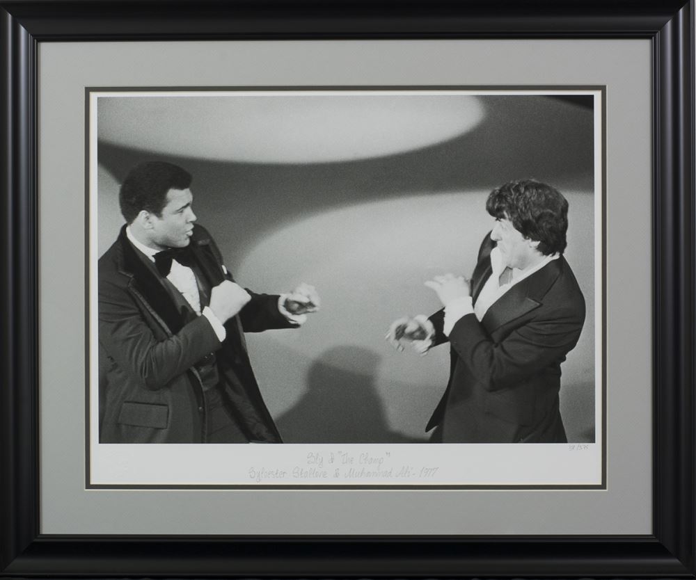 The custom frame measures 24" x 29" in size and features an 18" x 23" lithograph of Sylvester Stallone and Muhammad Ali. Please note, the autographs are facsimiles and the images shown are stock images. The winning bidder will receive a random number from the same edition.