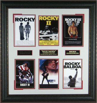 Rocky is a boxing saga of popular films all written by and starring Sylvester Stallone, who plays the character Rocky Balboa. The films are, by order of release date: Rocky (1976), Rocky II (1979), Rocky III (1982), Rocky IV (1985), Rocky V (1990) and Rocky Balboa (2006). The film series has grossed more than $1 billion at the worldwide box office. This is an overall approx size 30x28 Custom Matted and Premium Leather framed photo with 6 Mini Movie Posters of all 6 Rocky Movies.