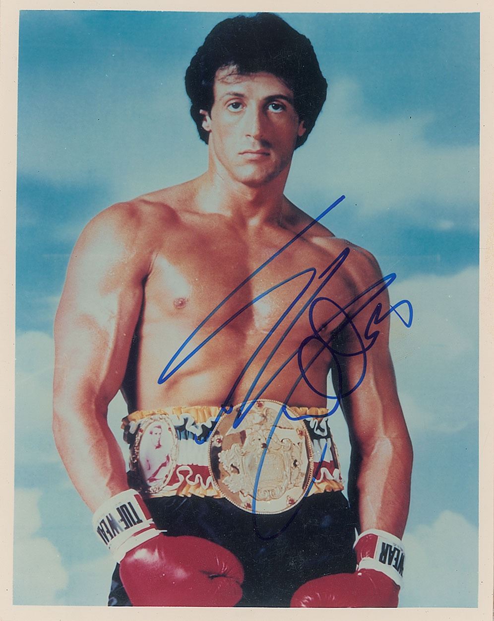 Color glossy 8 x 10 photo of Sylvester Stallone as he's pictured on the poster for Rocky III, signed in blue felt tip. In fine condition.