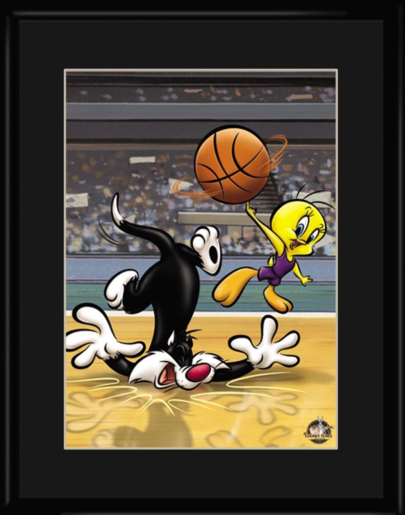 Sylvester and Tweety basketball lithograph featuring Looney Tunes characters Sylvester and Tweety. Perfect for any basketball player's room. Limited Edition. Comes matted and framed with Certificate of Authenticity. Size 11x14.Looney Tunes is a Warner Bros. animated cartoon series which ran in many movie theatres from 1930 to 1969. It preceded the Merrie Melodies series and is Warner Bros.'s first animated theatrical series. The regular Warner Bros. animation cast also became known as the "Looney Tunes"