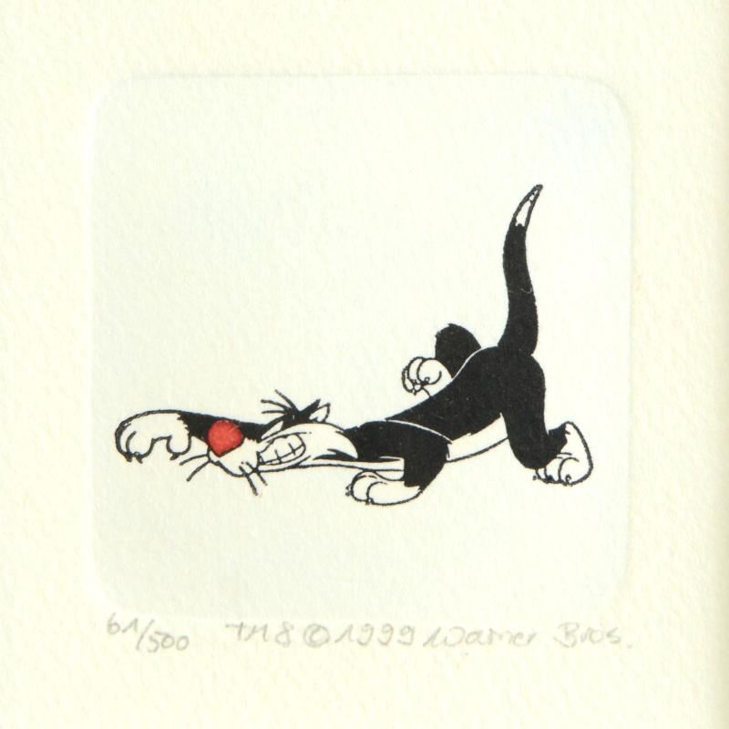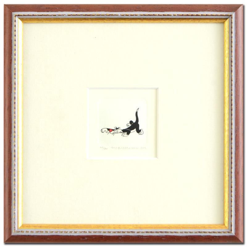 "Sylvester" is a limited edition etching on paper with hand-tinted coloring from Warner Bros. (dated 1999) and numbered! This piece is framed. Measures approx. 8.5" x 8.5" (with frame), 1.5" x 1" (each image).